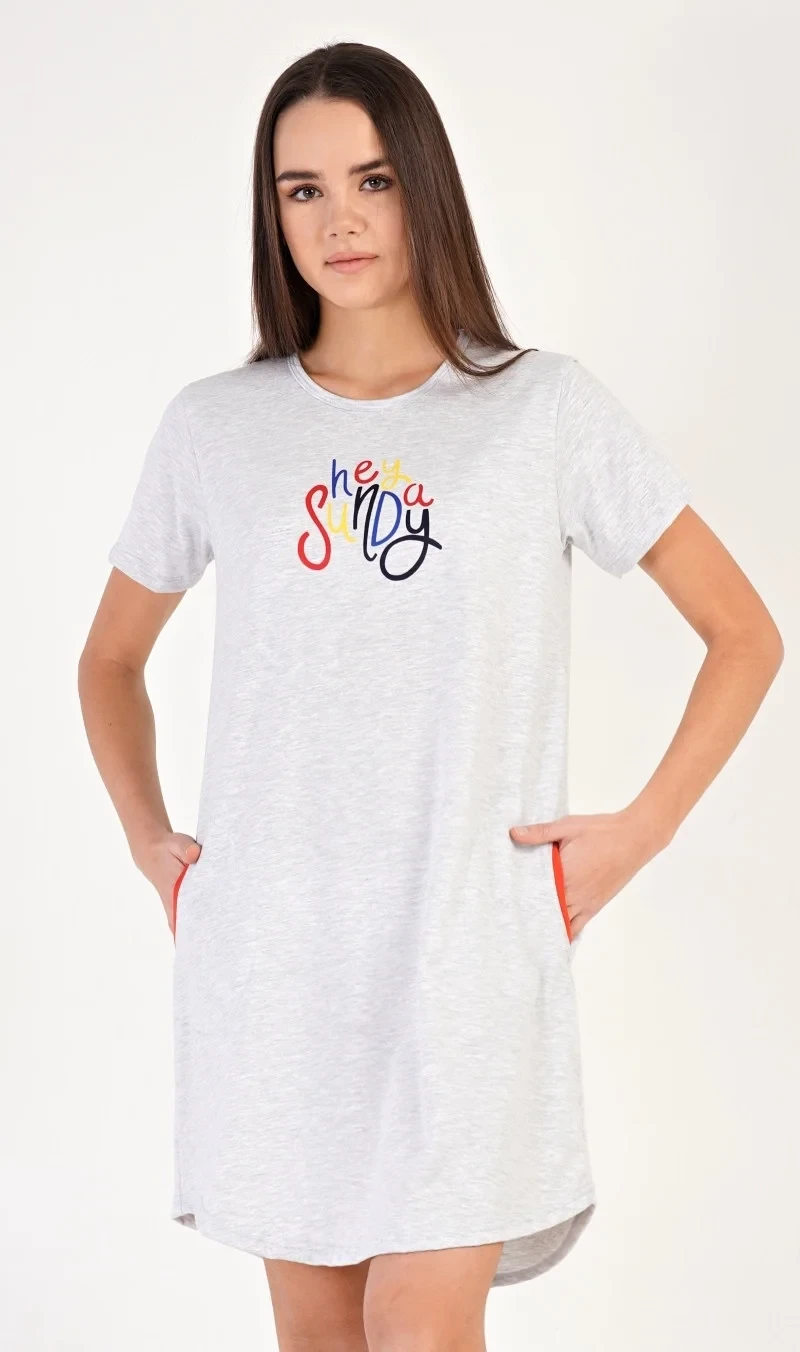 Dámské domácí šaty s krátkým rukávem Hey sunday. Pohodlné jednobarevné domácí šaty s kulatým výstřihem jsou ozdobeny nápisem HEY SUNDAY. Šaty mají praktické kapsy, které jsou olemovány kontrastní lemovkou. Použitý materiál s podílem bavlny 70% je příjemný a poddajný na dotek. Šaty jsou vhodné na spaní i na denní nošení.