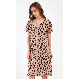 Dámské bavlněné domácí šaty s krátkým rukávem Leopard. Pohodlné rozepínací šaty v příjemné délce pod kolena využijete téměř při všech volnočasových aktivitách. Mají praktické kapsy a zapínání na zip. Béžové šaty jsou potištěny leopardím vzorem. Použitý bavlněný materiál je příjemný a poddajný na dotek.