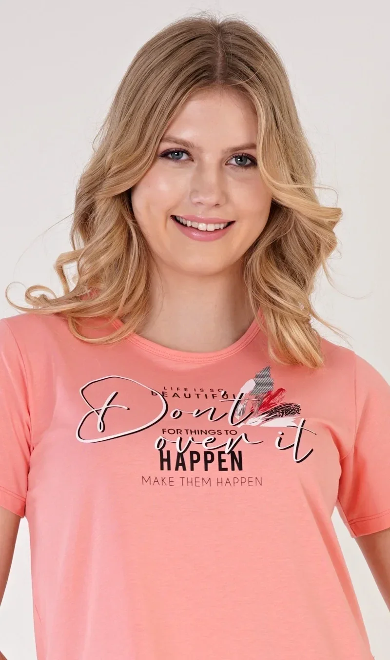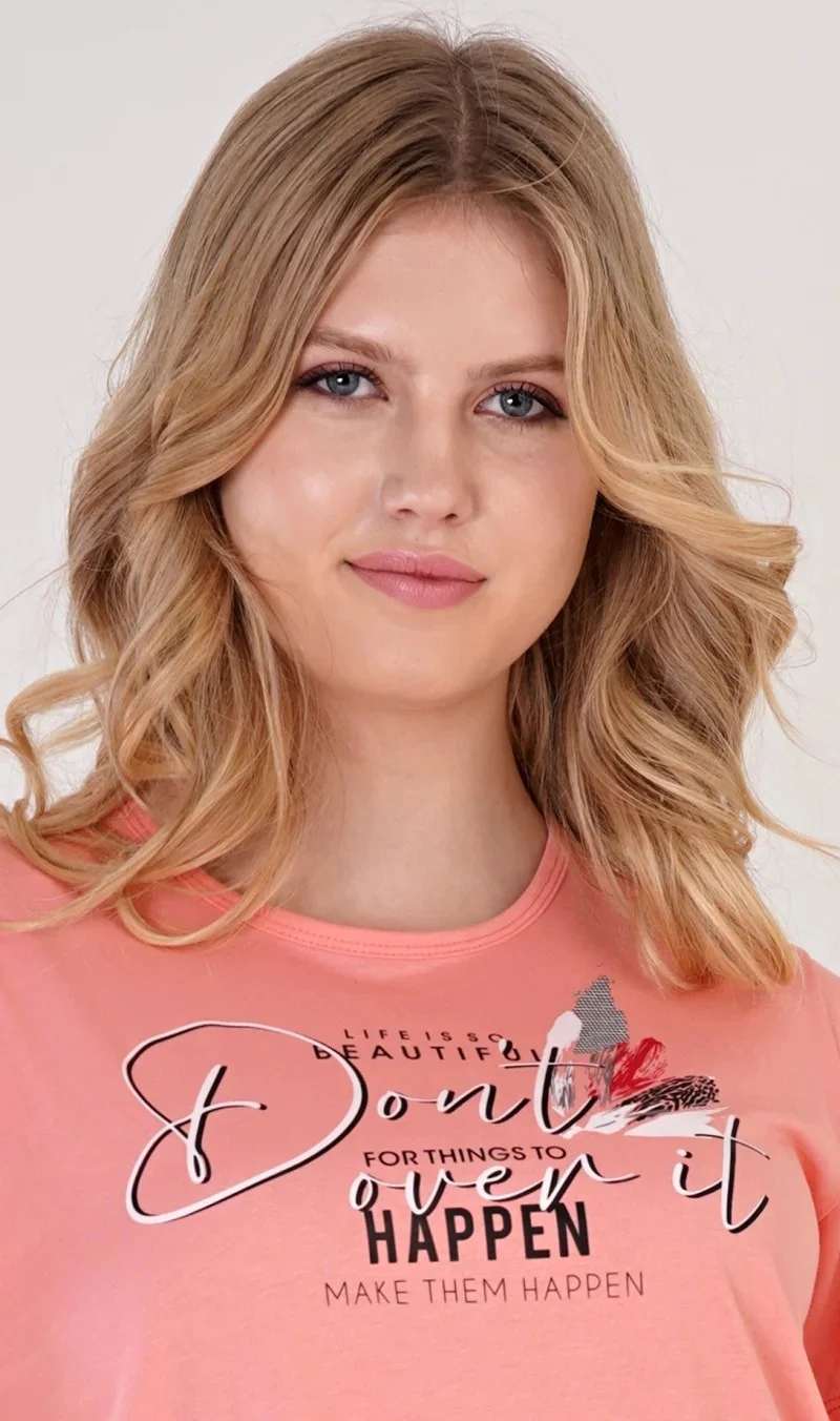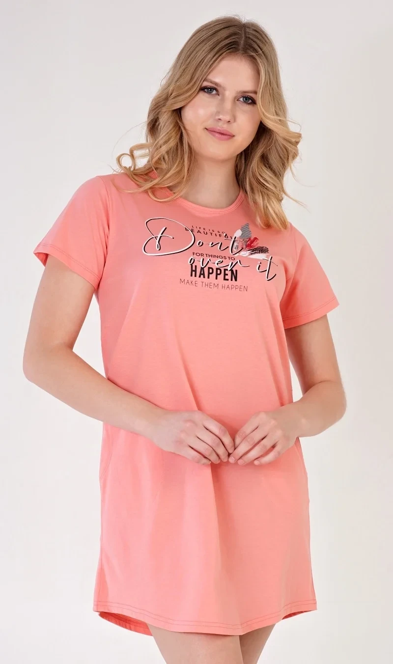 Dámské bavlněné domácí šaty s krátkým rukávem Lucie. Pohodlné jednobarevné domácí šaty s kulatým výstřihem jsou ozdobeny pestrým potiskem. Šaty mají praktické kapsy. Použitý bavlněný materiál je příjemný a poddajný na dotek. Domácí šaty jsou vhodné na spaní i na denní nošení.