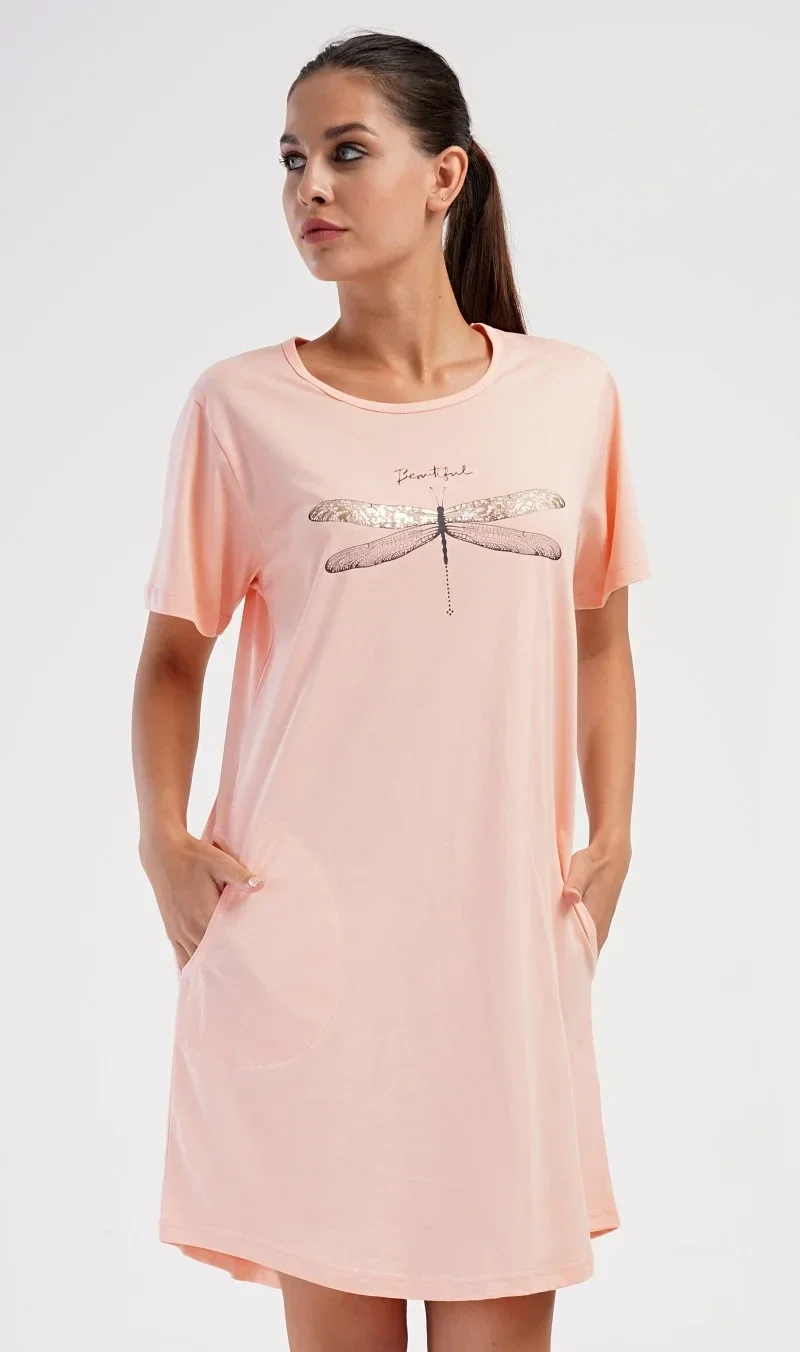 Dámské bavlněné domácí šaty s krátkým rukávem Vážka. Domácí jednobarevné šaty s kulatým výstřihem a kapsami zdobí obrázek vážky a nápis 'Beautiful'. Použitý bavlněný materiál je příjemný a poddajný na dotek. Šaty jsou pohodlné, využijete je téměř při všech volnočasových aktivitách. Jsou vhodné na spaní i na denní nošení.