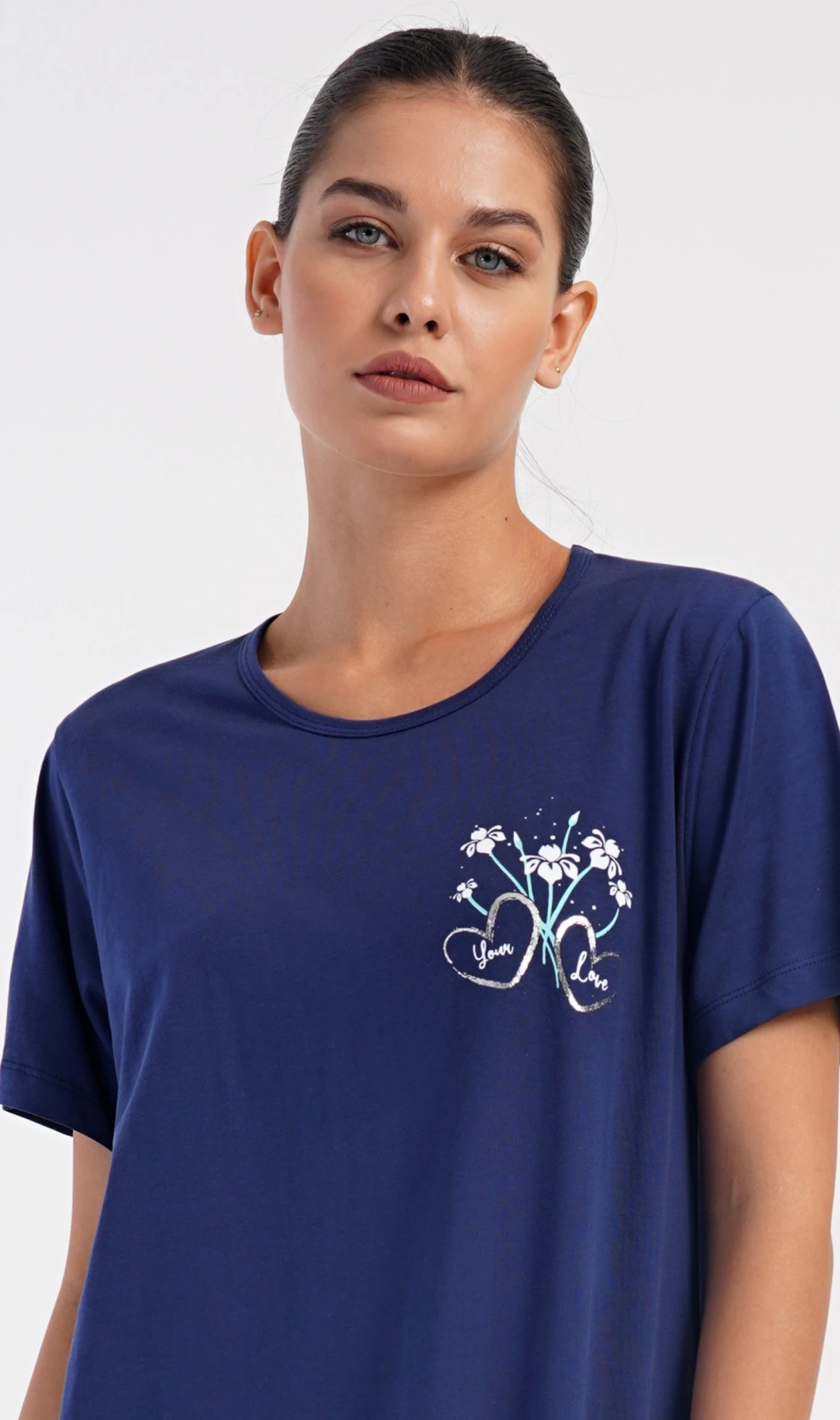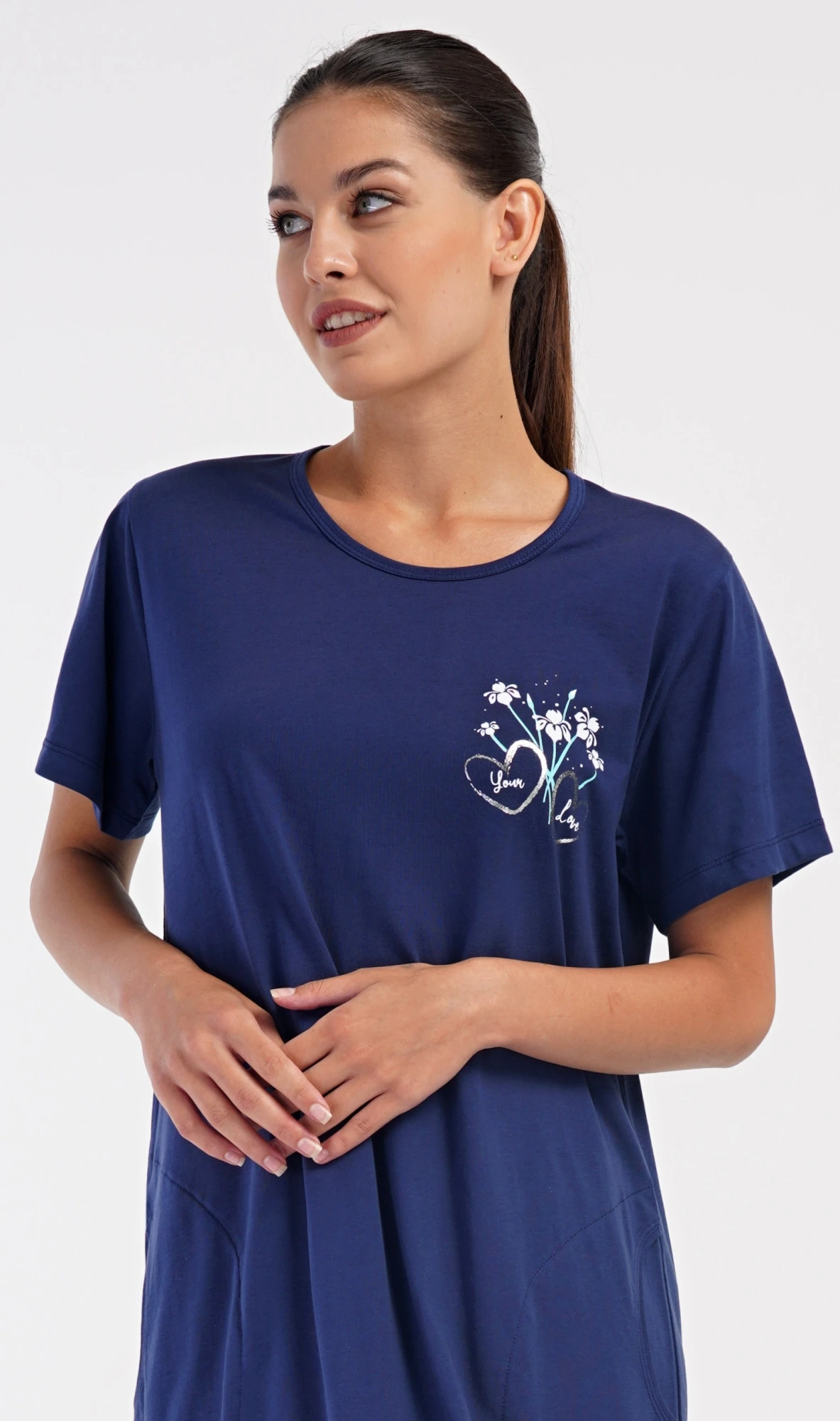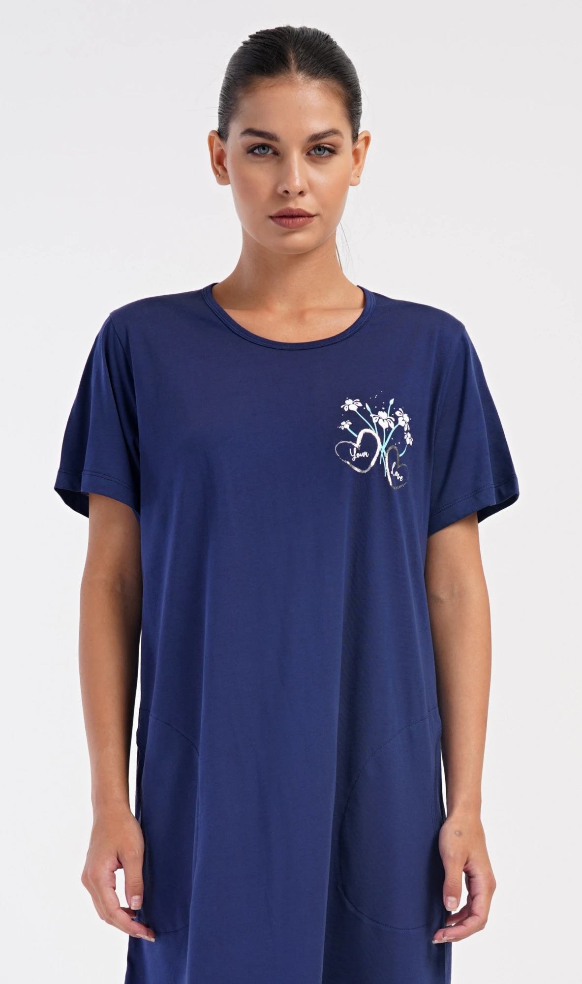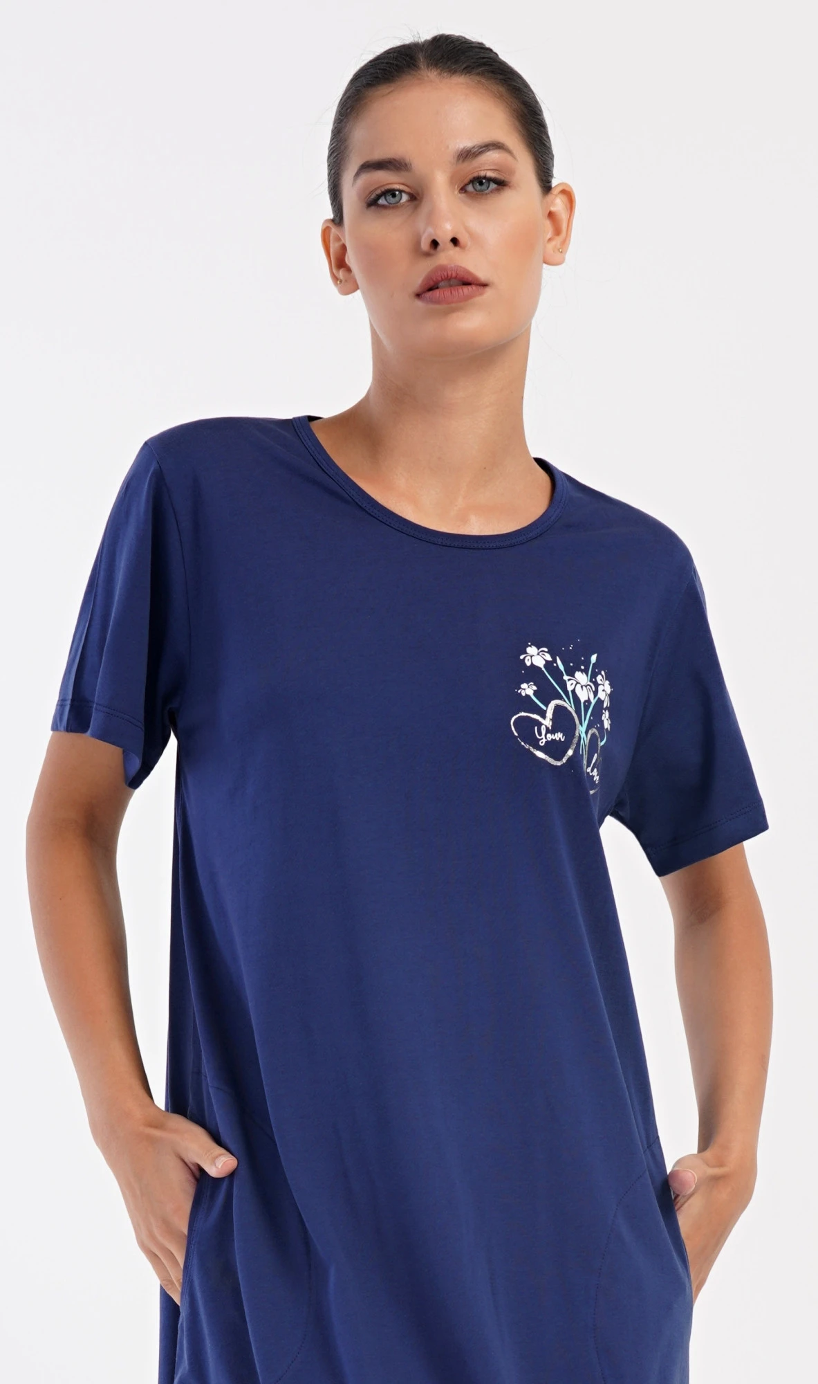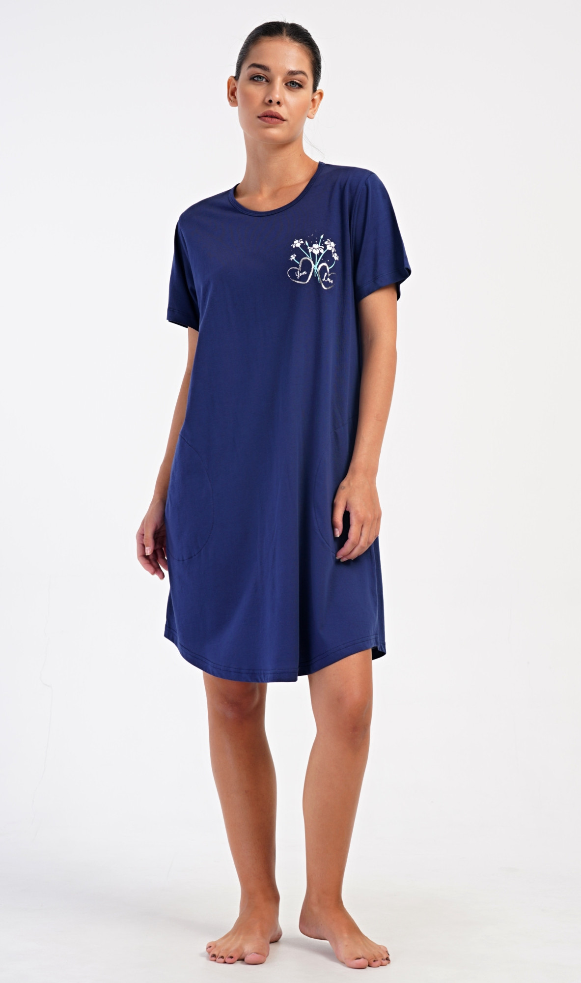 Dámské bavlněné domácí šaty s krátkým rukávem Janette. Domácí jednobarevné šaty s kulatým výstřihem a kapsami zdobí na hrudi obrázek s květinovým motivem. Použitý bavlněný materiál je příjemný a poddajný na dotek. Šaty jsou pohodlné, vhodné na spaní i na denní nošení.