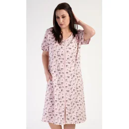 Dámské bavlněné domácí šaty s krátkým rukávem Olivia. Pohodlné rozepínací šaty v příjemné délce pod kolena využijete téměř při všech volnočasových aktivitách. Mají praktické kapsy a zapínání na zip. Šaty jsou decentně potištěny květy. Použitý bavlněný materiál je příjemný a poddajný na dotek.