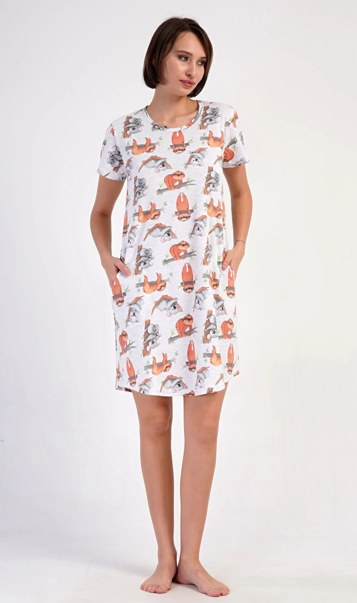Dámské domácí šaty s krátkým rukávem Ospalci. Domácí šaty se vzorem ospalých medvídků mají kulatý výstřih a praktické kapsy. Použitý materiál s obsahem bavlny 70% je příjemný a poddajný na dotek. Šaty jsou pohodlné, využijete je téměř při všech volnočasových aktivitách. Jsou vhodné na spaní i na denní nošení.