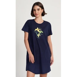 Dámské bavlněné domácí šaty s krátkým rukávem Paula. Domácí šaty s kulatým výstřihem a kapsami zdobí obrázek květů a drobné nápisy. Použitý bavlněný materiál je příjemný a poddajný na dotek. Šaty jsou pohodlné, využijete je téměř při všech volnočasových aktivitách. Šaty jsou vhodné na spaní i na denní nošení.