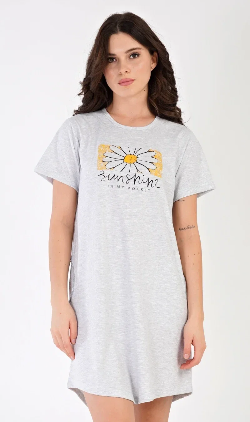 Dámské domácí šaty s krátkým rukávem Sunshine. Dámské šaty s kulatým výstřihem jsou zdobeny potiském kopretiny a nápisem SUNSHINE. Na bocích mají všité kapsy. Použitý materiál s podílem bavlny 70% je příjemný a poddajný na dotek. Šaty jsou vhodné na spaní i na denní nošení.