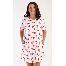 Dámské domácí šaty s krátkým rukávem Valentýna. Romantické, ale šik šaty s kulatým výstřihem a kapsami. Jsou potištěny srdíčky v jahodové barvě na světle šedém podkladu. Použitý materiál je jemný a poddajný na dotek. Šaty jsou pohodlné, a jistě je využijete téměř při všech volnočasových aktivitách. Šaty jsou vhodné na spaní i na denní nošení.