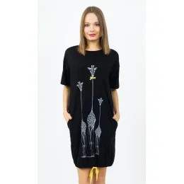 Dámské bavlněné domácí šaty s krátkým rukávem Žirafy. Pohodlné dámské domácí šaty s prodlouženým krátkým rukávem a praktickými kapsami mají na přední straně výrazný obrázek tří žiraf s dlouhými krky. Prostřední žirafa má na krku žlutou mašličku. Šaty jsou zakončeny šňůrkou ke stažení, díky které si můžete upravit i finální vzhled šatů. Použitý bavlněný materiál je příjemný a poddajný na dotek. Domácí šaty jsou určeny na spaní i na denní nošení.