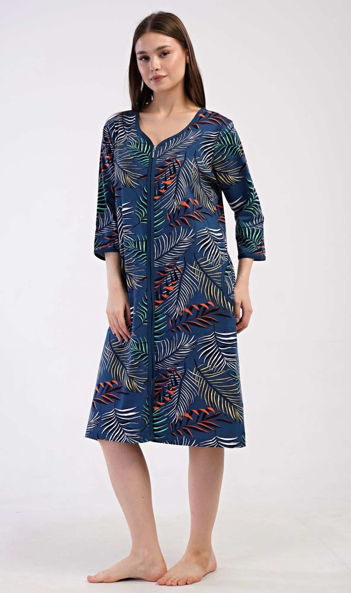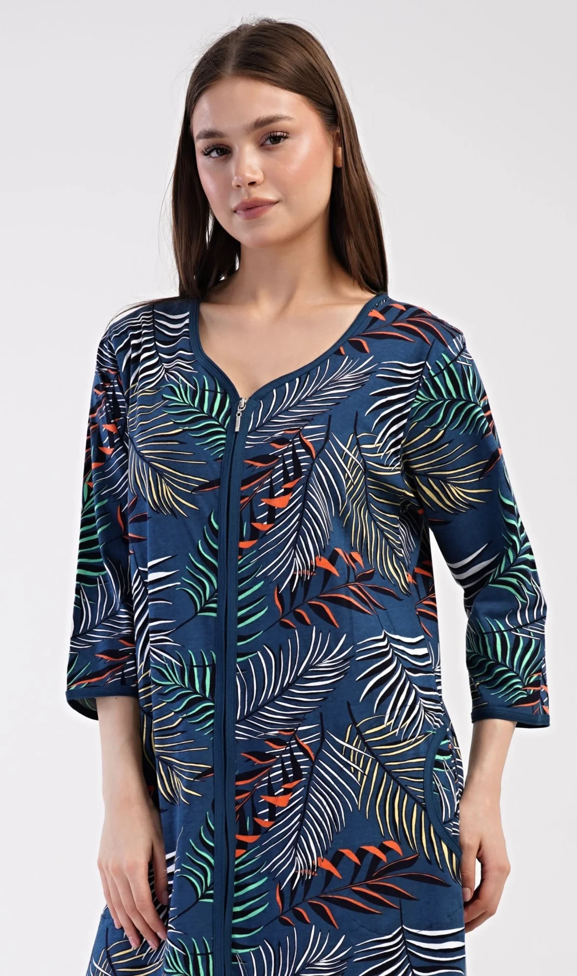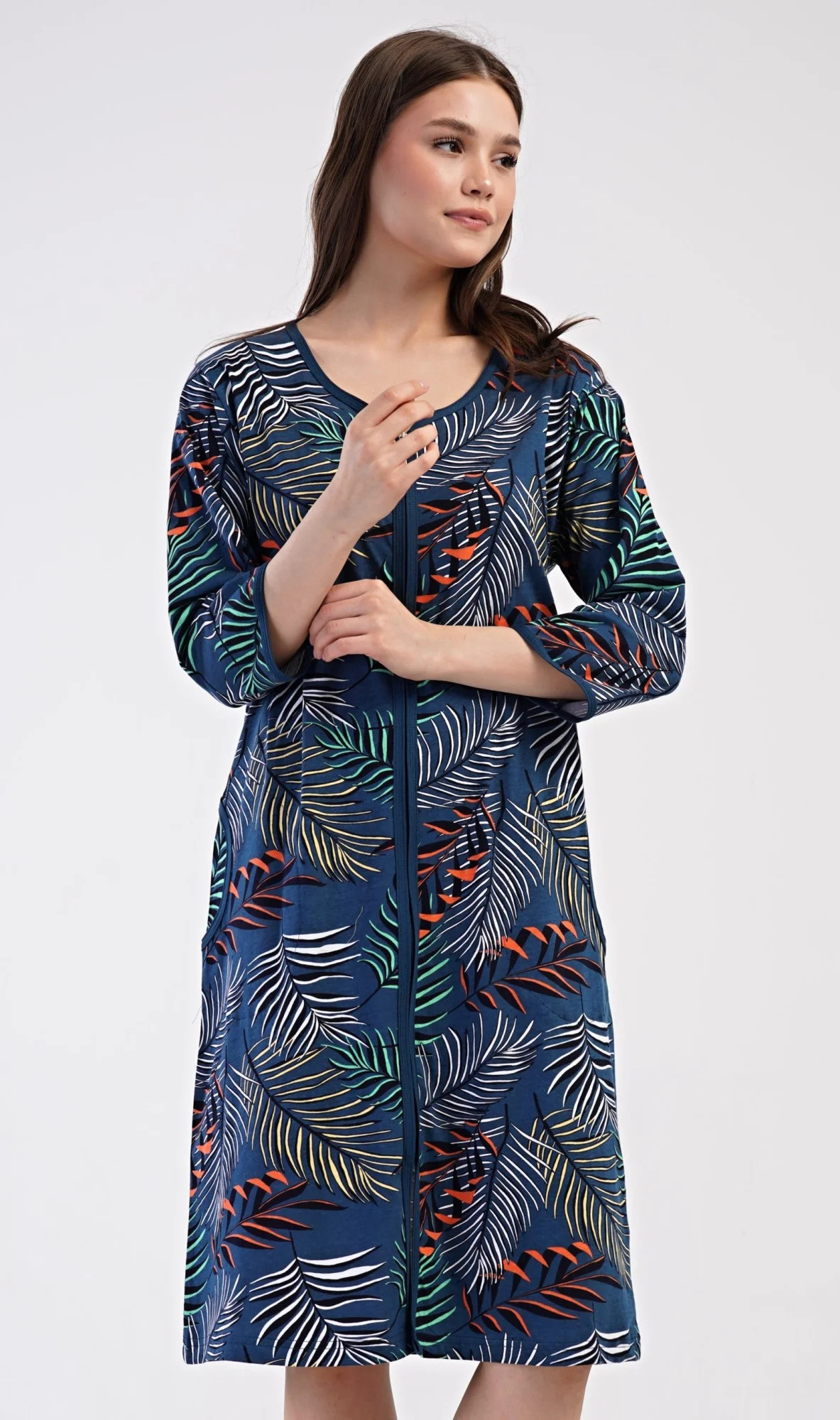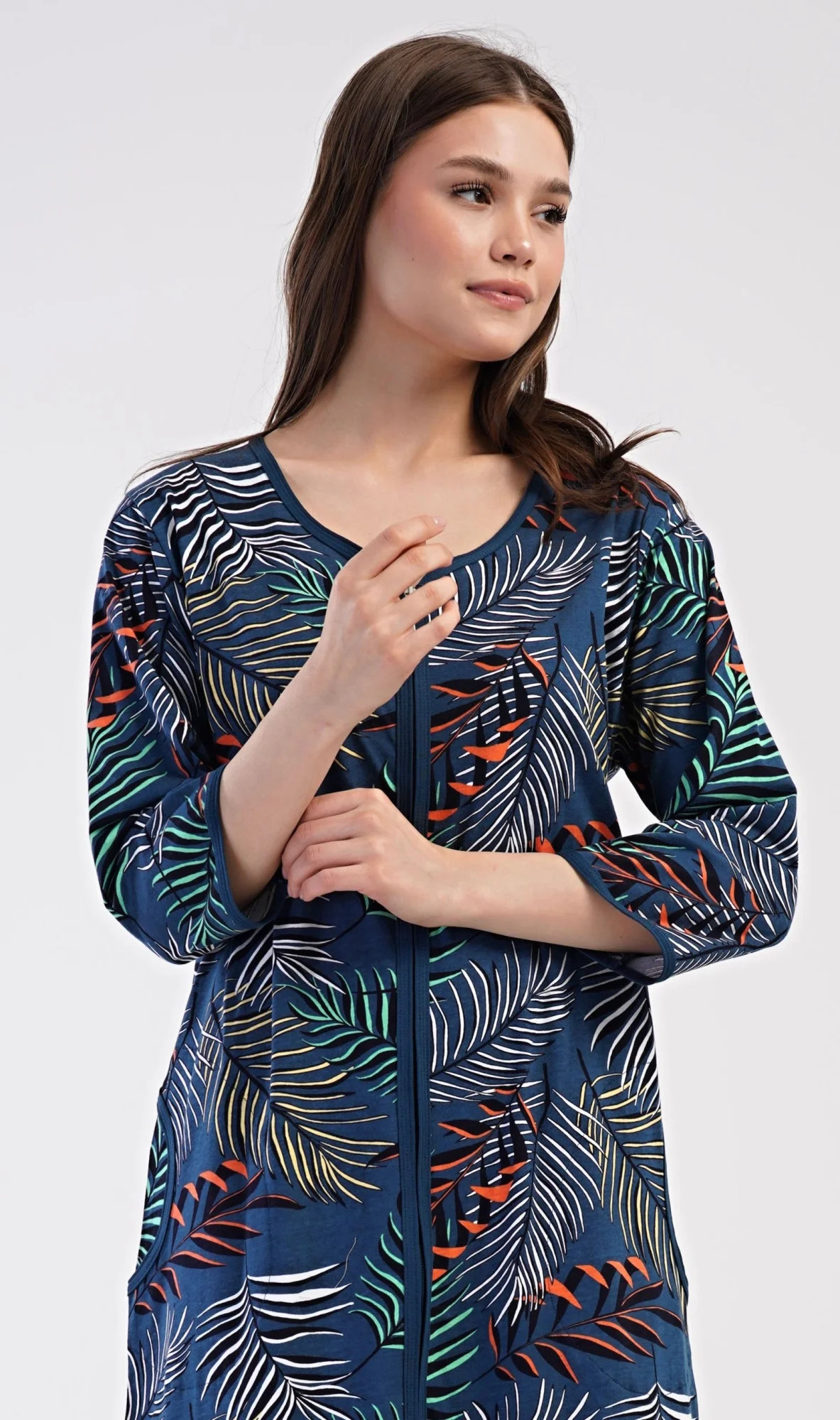 Dámské bavlněné domácí šaty s tříčtvrtečním rukávem Barbara. Pohodlné rozepínací šaty v příjemné délce pod kolena využijete téměř při všech volnočasových aktivitách. Mají praktické kapsy a zapínání na zip. Šaty jsou potištěny exotickými listy. Použitý bavlněný materiál je příjemný a poddajný na dotek.