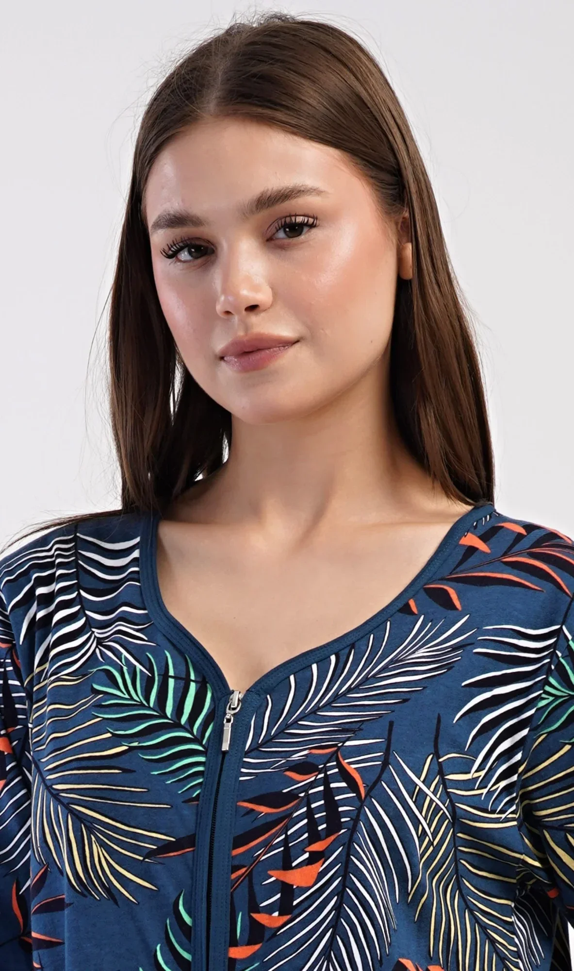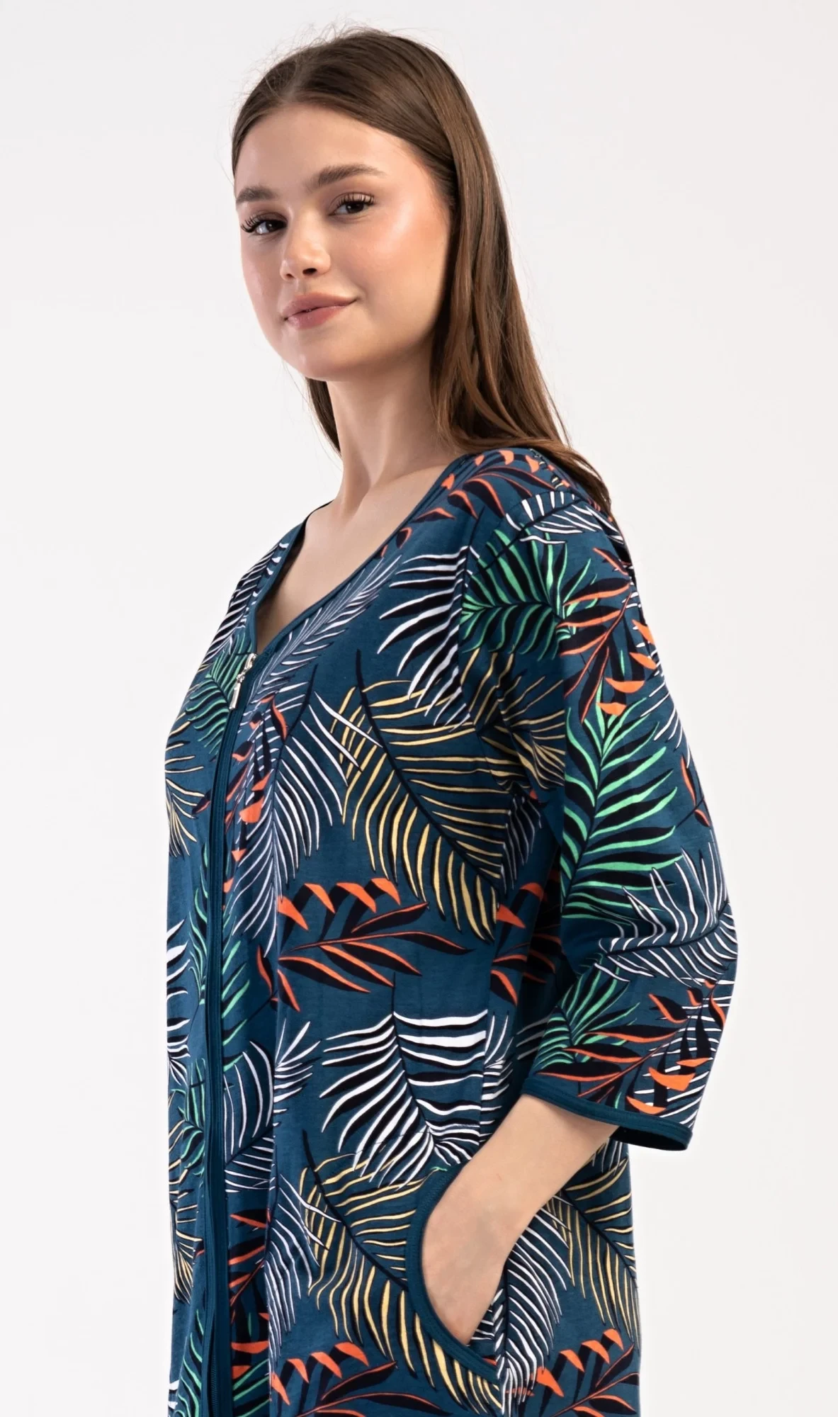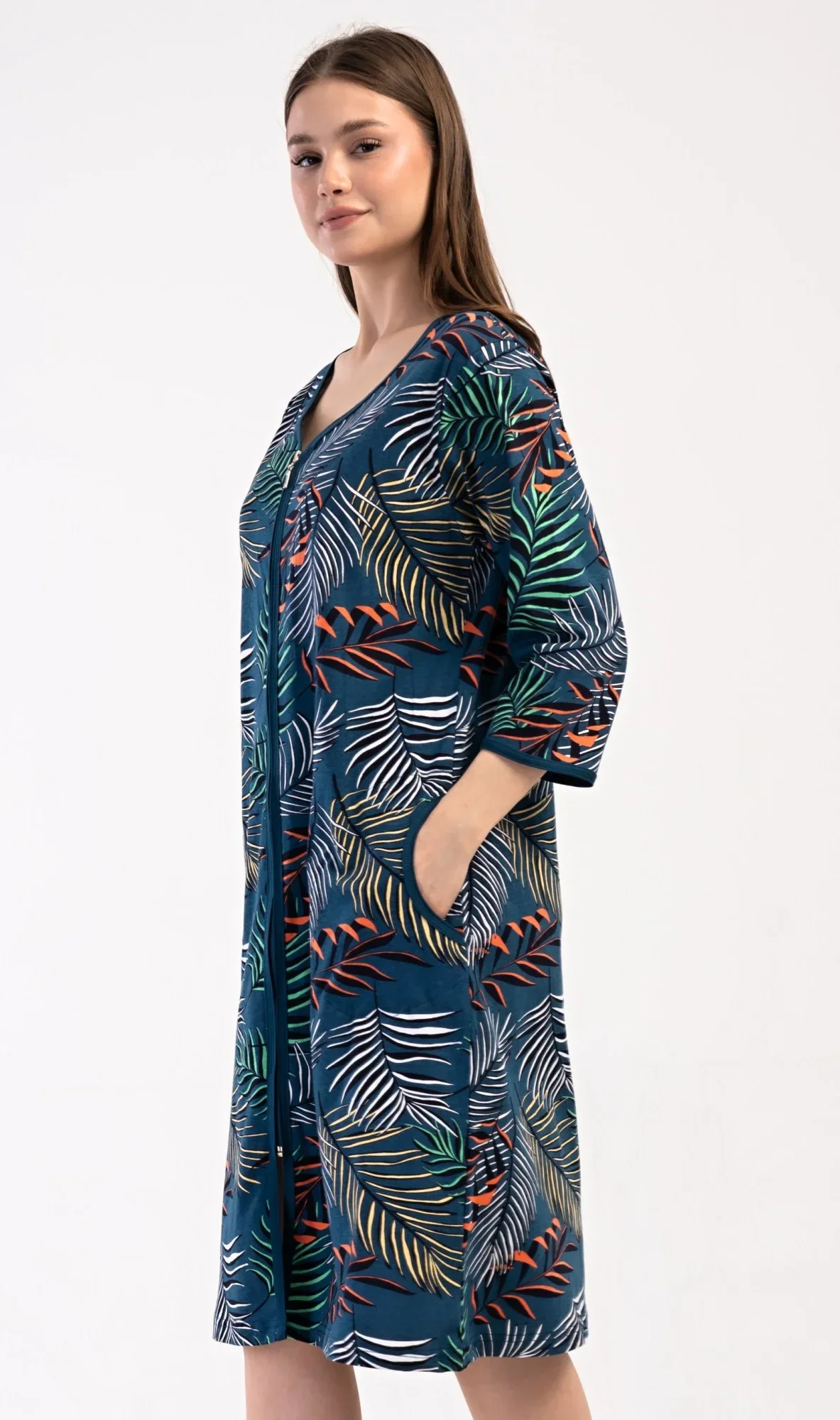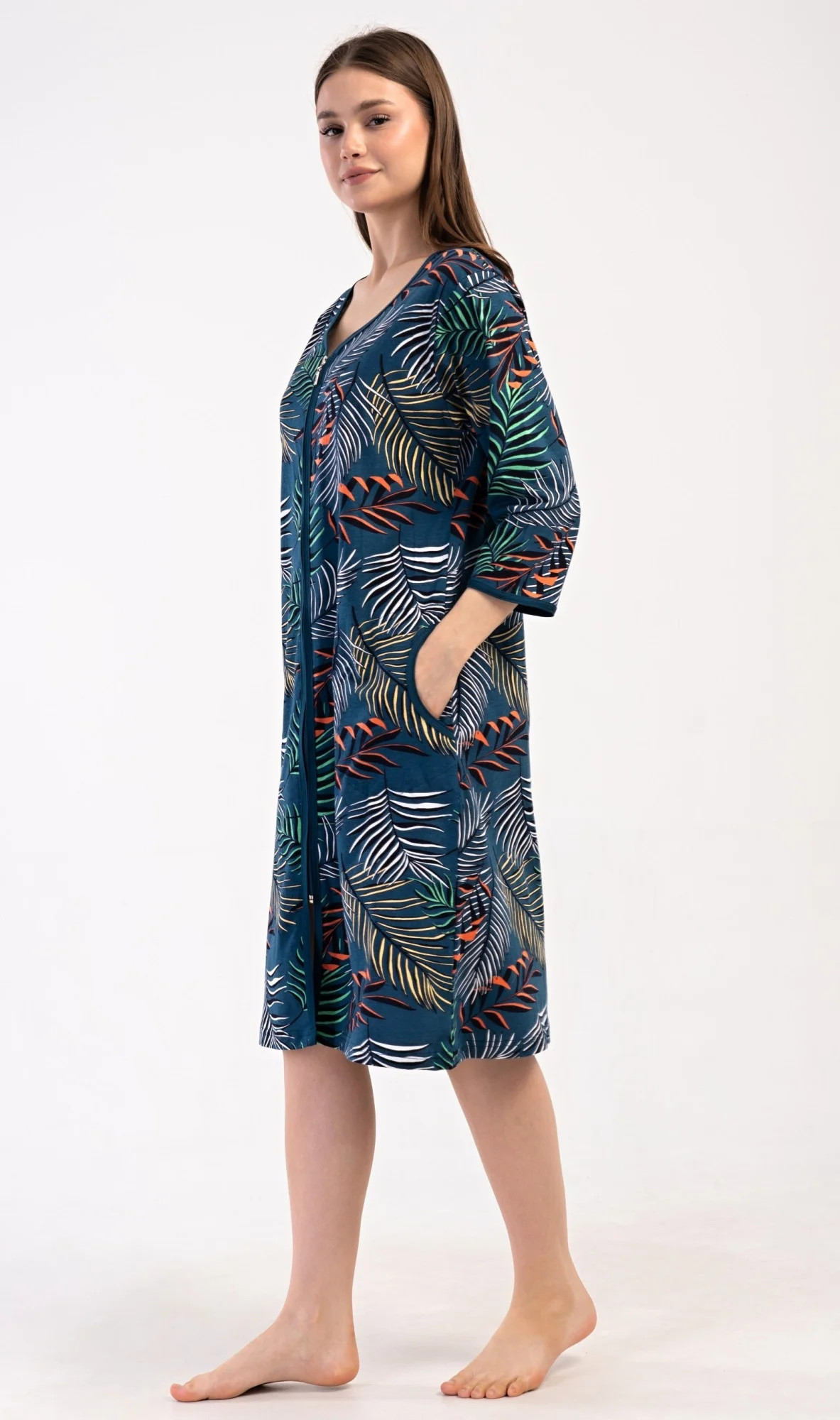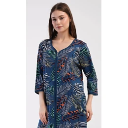 Dámské bavlněné domácí šaty s tříčtvrtečním rukávem Barbara. Pohodlné rozepínací šaty v příjemné délce pod kolena využijete téměř při všech volnočasových aktivitách. Mají praktické kapsy a zapínání na zip. Šaty jsou potištěny exotickými listy. Použitý bavlněný materiál je příjemný a poddajný na dotek.
