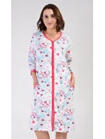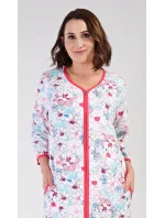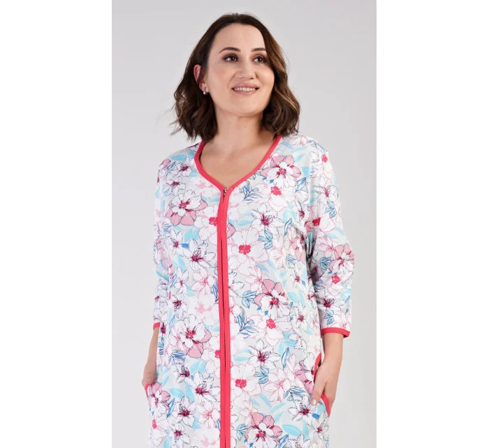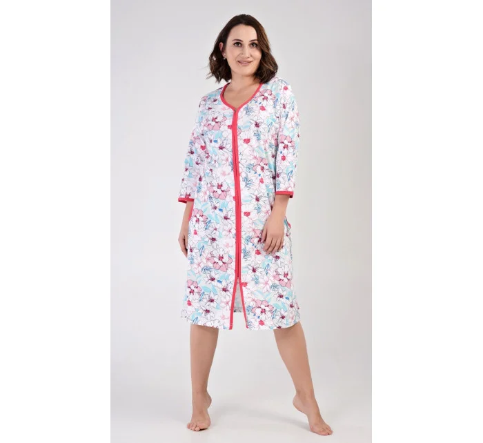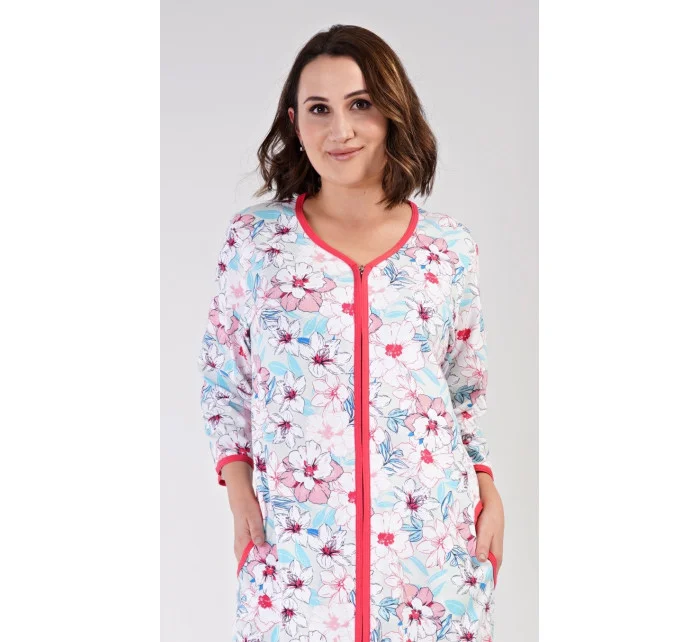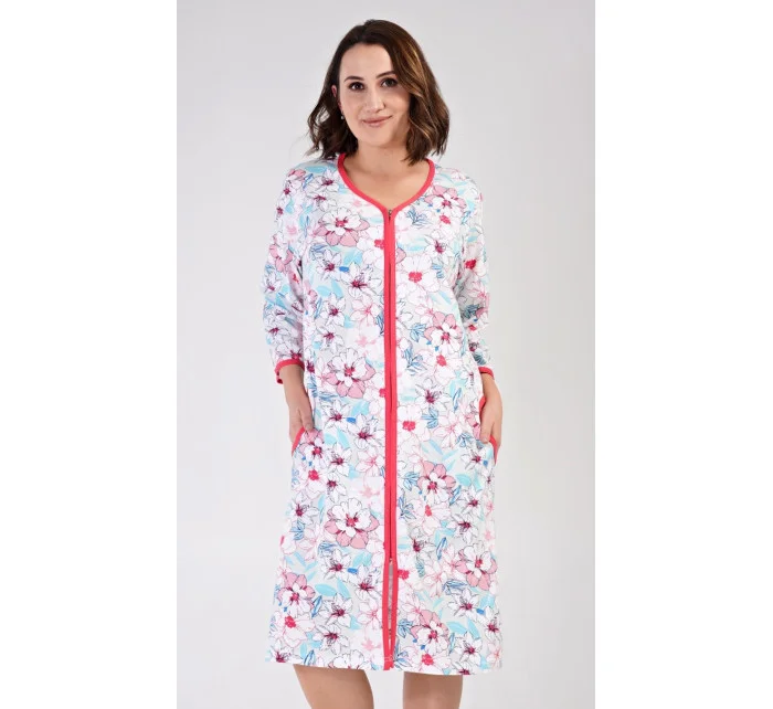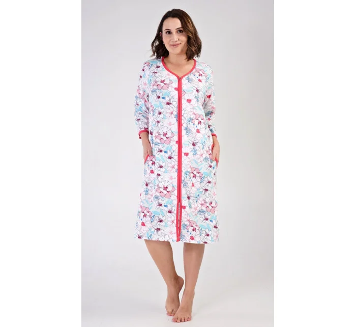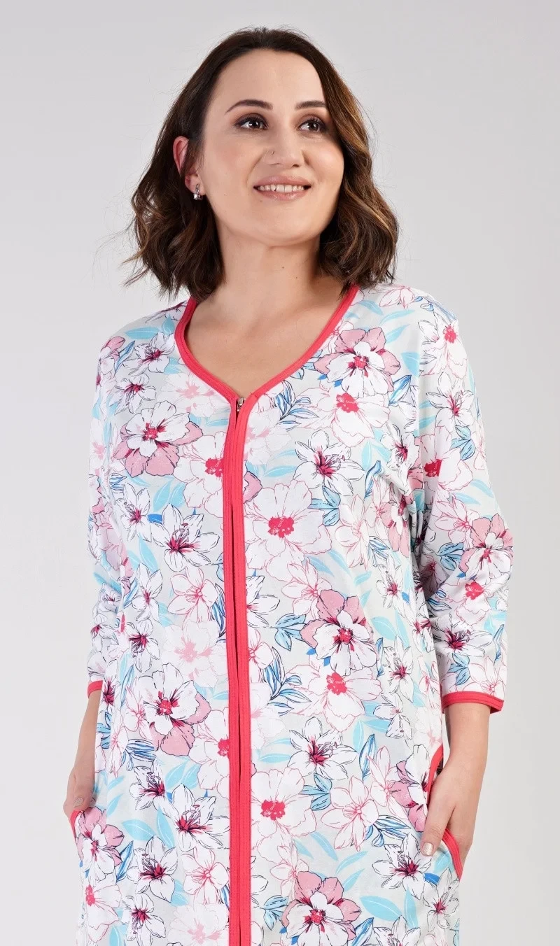 Dámské bavlněné domácí šaty s tříčtvrtečním rukávem Elen. Domácí šaty mají zapínání na zip a jsou ozdobené potiskem květin. Na předním díle jsou našité na bocích praktické kapsy. Bavlněný materiál je poddajný a příjemný na dotek.