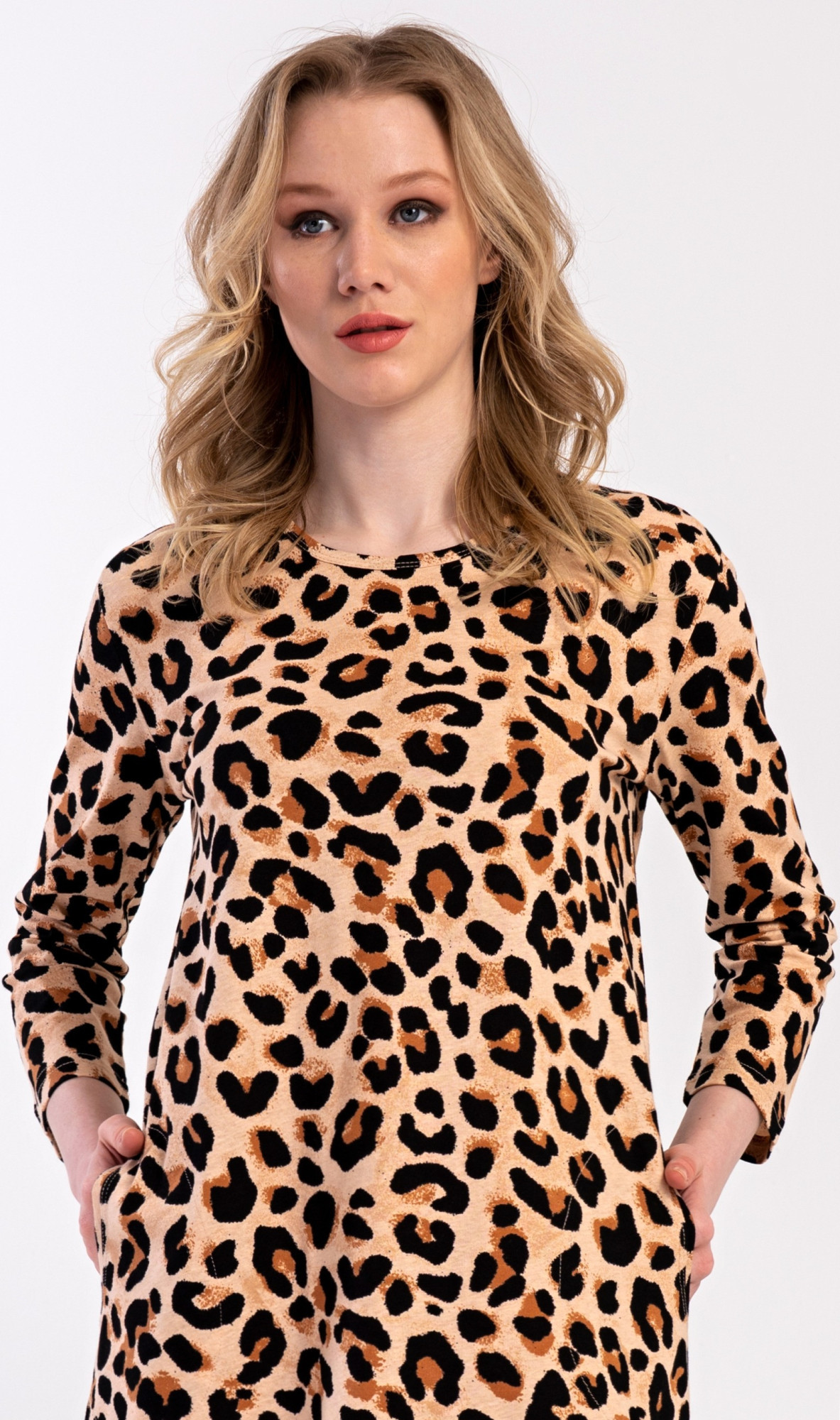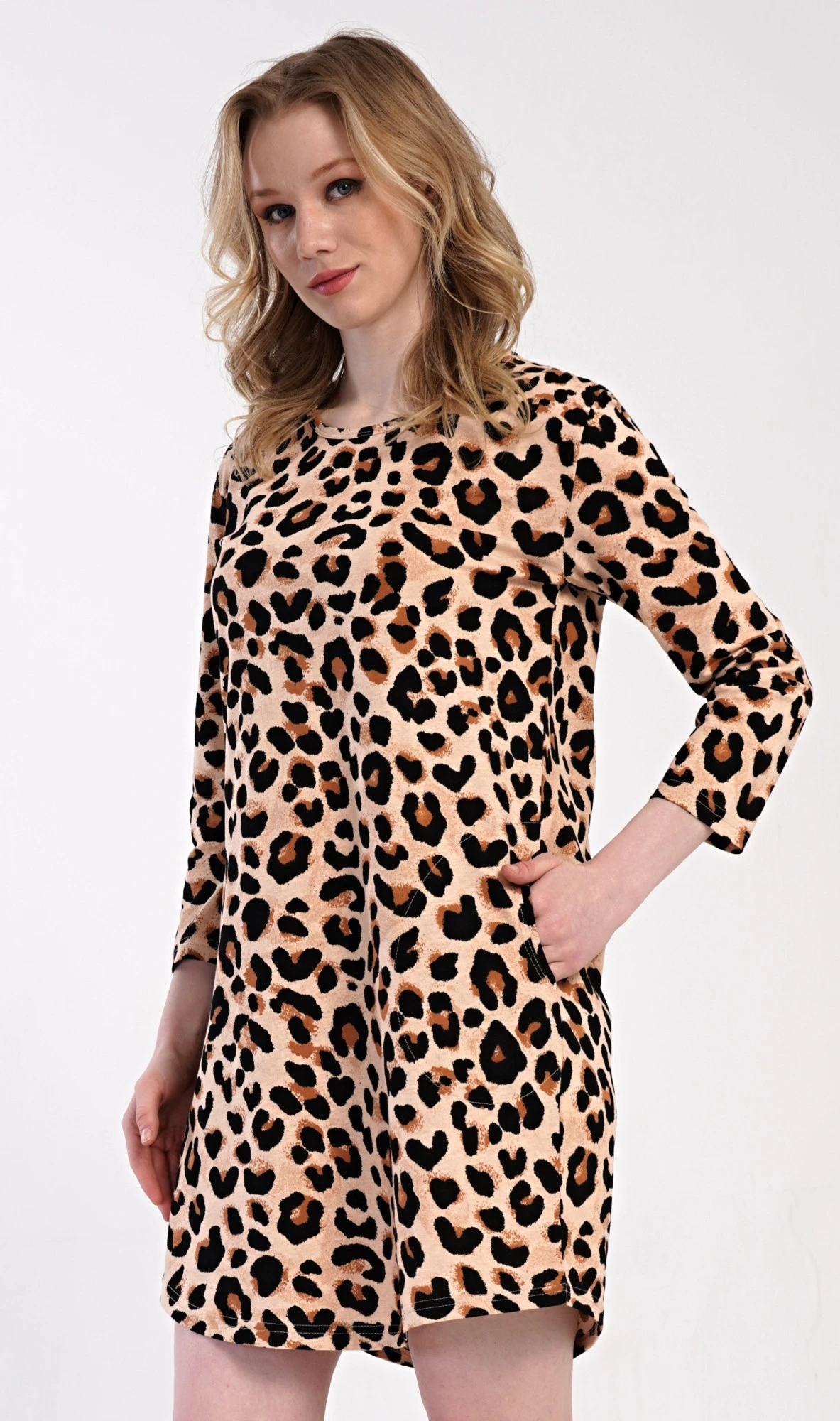 Dámské bavlněné domácí šaty s tříčtvrtečním rukávem Leona. Domácí bavlněné šaty s kulatým výstřihem a kapsami zdobí obrázky leopardí potisk. Použitý bavlněný materiál je příjemný a poddajný na dotek. Pohodlné domácí šaty jsou vhodné také na spaní.