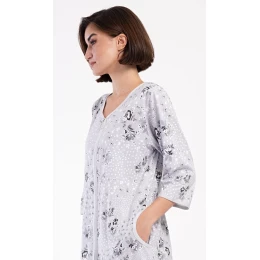 Dámské bavlněné domácí šaty s tříčtvrtečním rukávem Matylda. Pohodlné rozepínací šaty v příjemné délce pod kolena využijete téměř při všech volnočasových aktivitách. Mají praktické kapsy a zapínání na zip. Šedé šaty jsou potištěny decentními květy. Použitý bavlněný materiál je příjemný a poddajný na dotek.