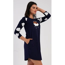 Dámské bavlněné domácí šaty s tříčtvrtečním rukávem Méďa na obláčku. Domácí bavlněné šaty s kulatým výstřihem mají praktické kapsy a zdobí je na hrudi obrázek medvídka, který spí na obláčku. Použitý bavlněný materiál je příjemný a poddajný na dotek.