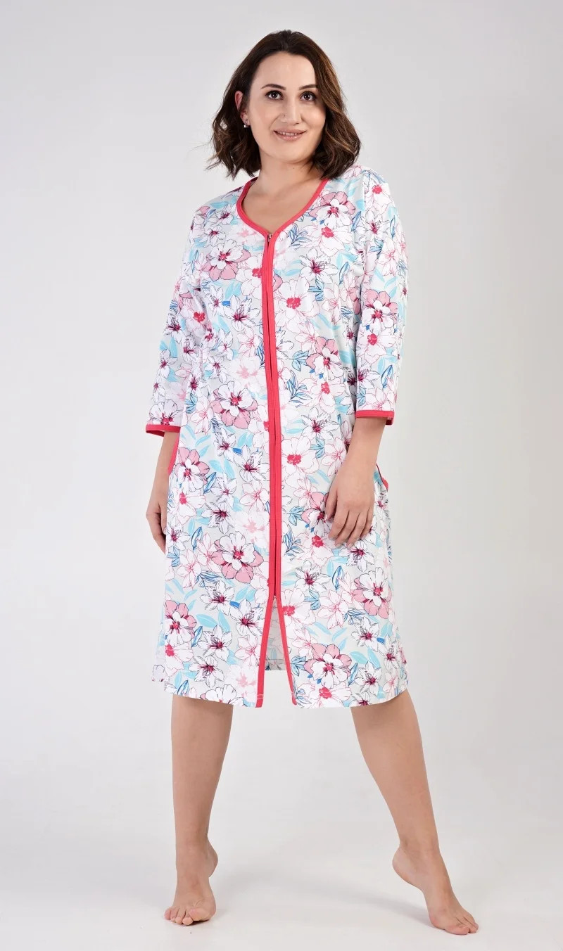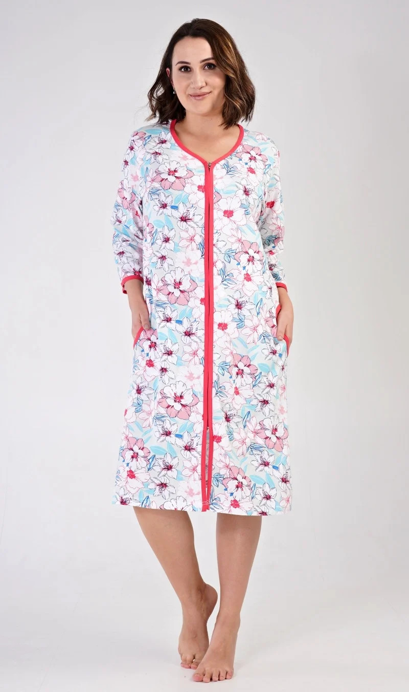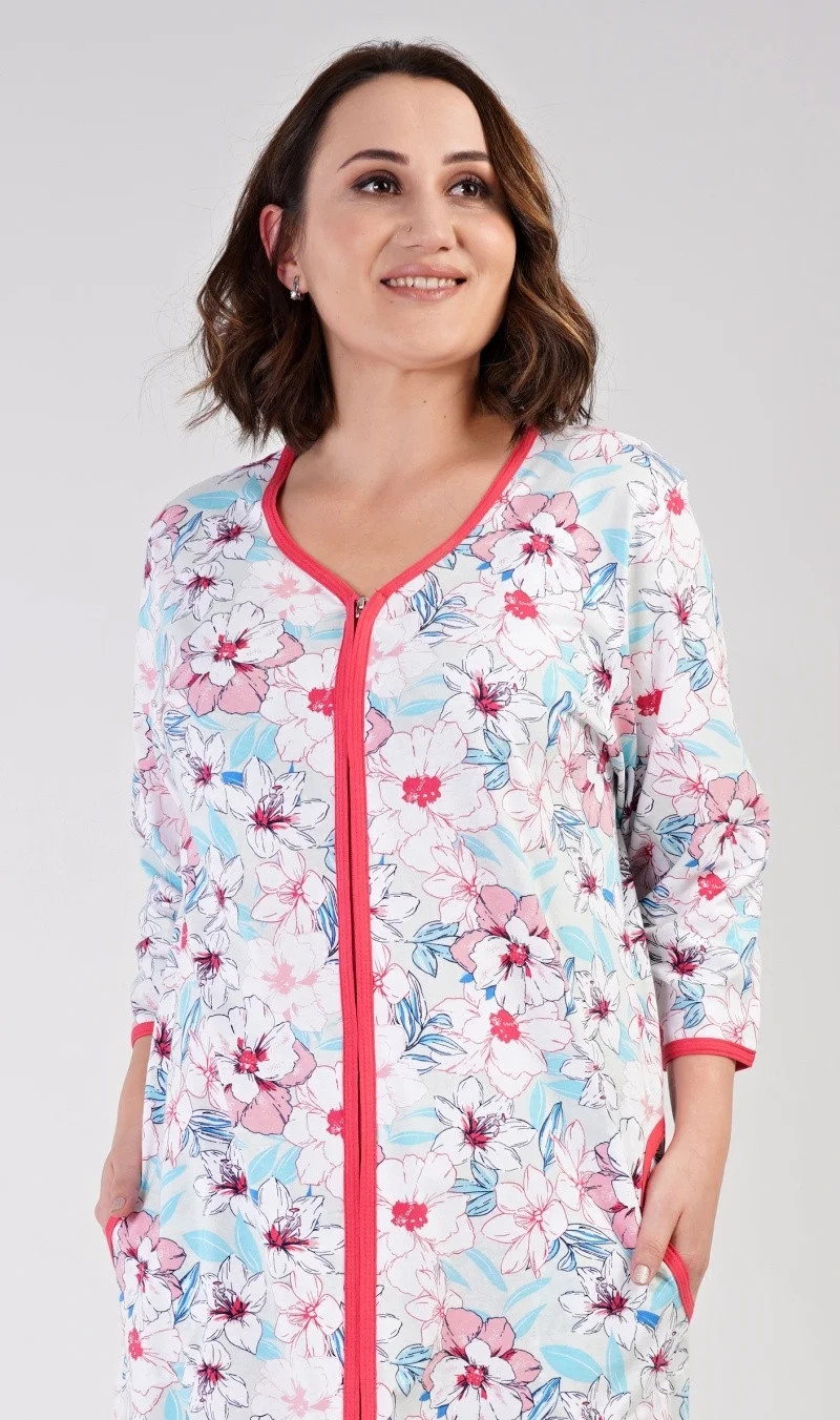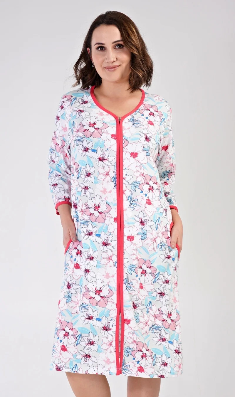 Dámské bavlněné domácí šaty s tříčtvrtečním rukávem Elen. Domácí šaty mají zapínání na zip a jsou ozdobené potiskem květin. Na předním díle jsou našité na bocích praktické kapsy. Bavlněný materiál je poddajný a jemný na dotek.