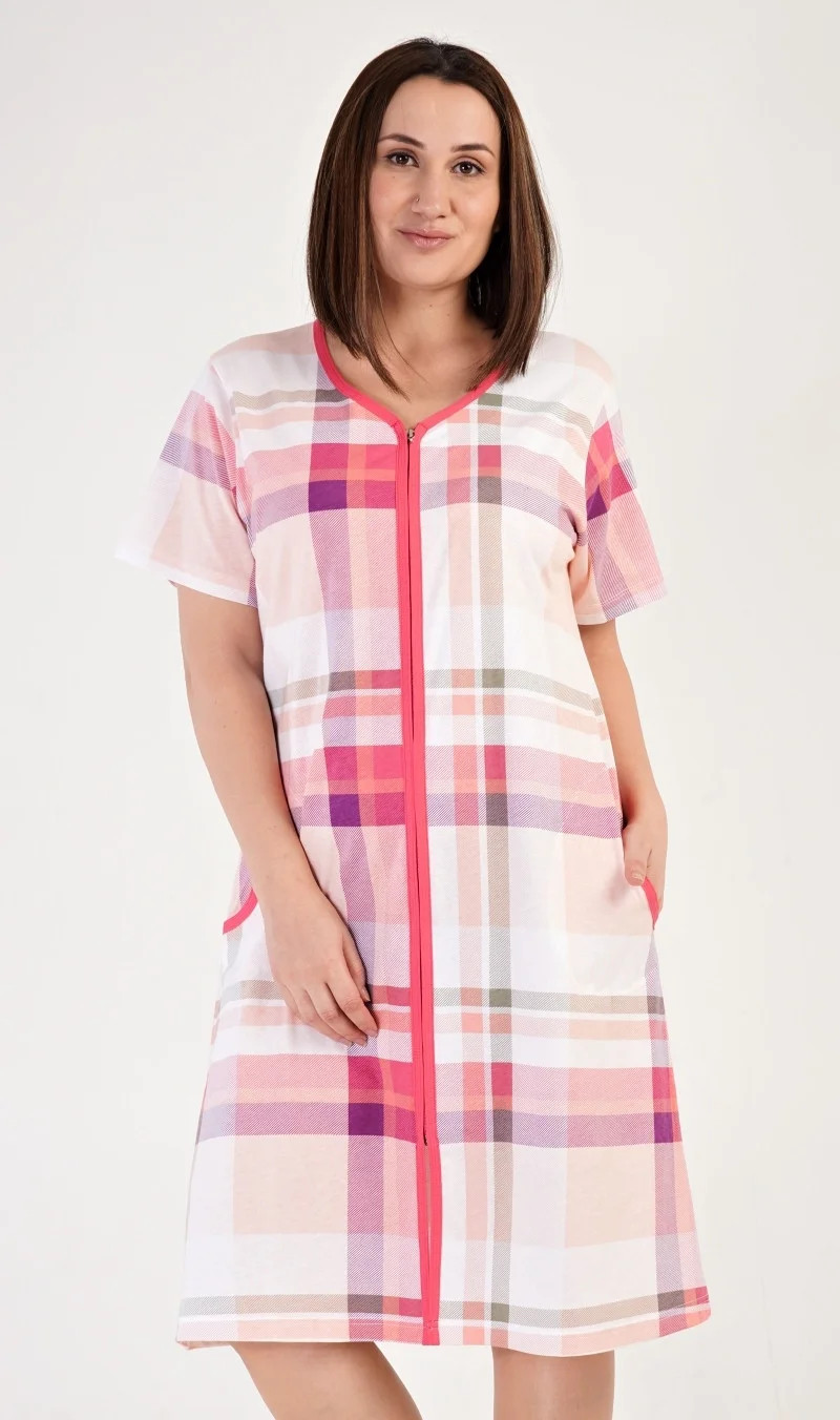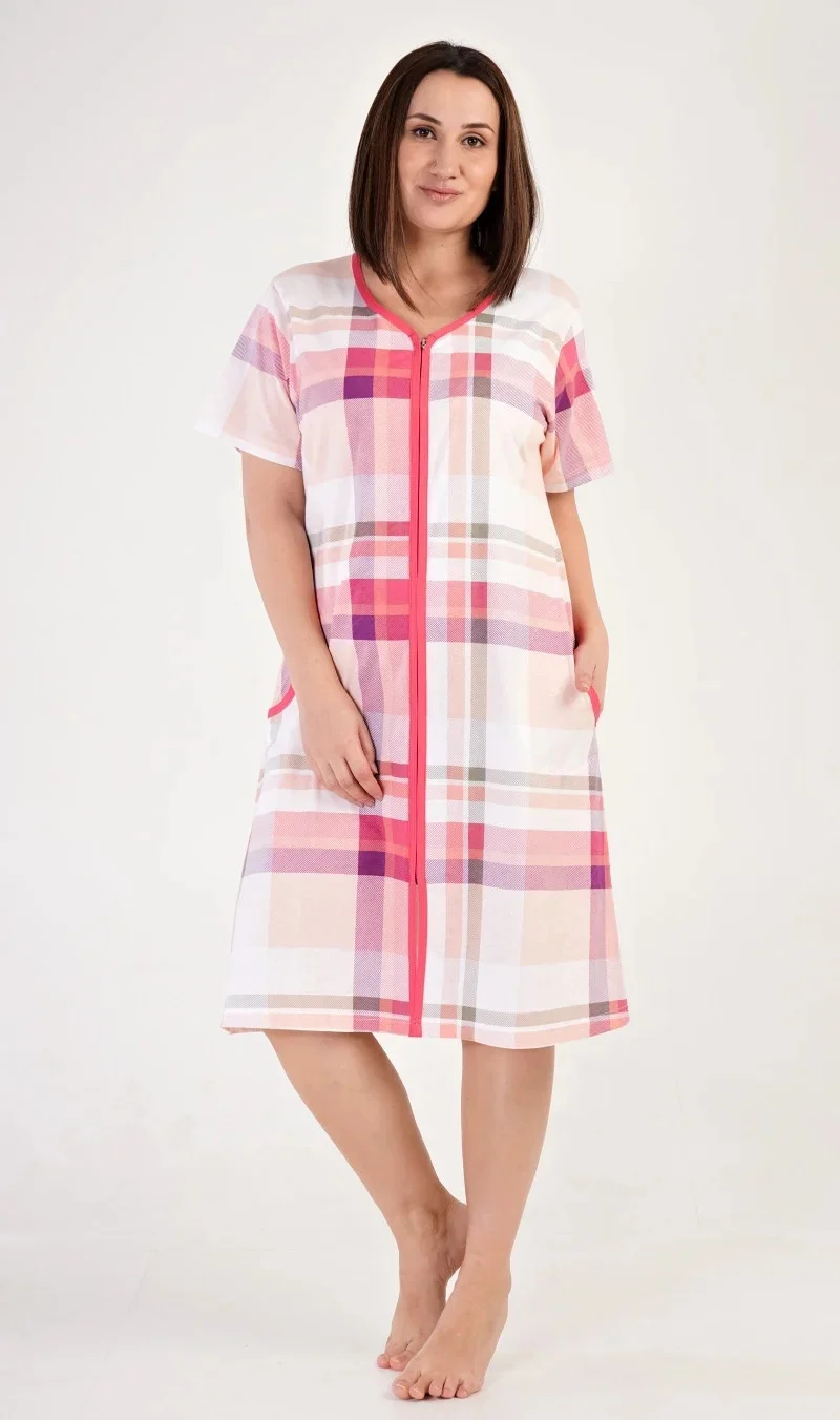 Dámské bavlněné domácí šaty s tříčtvrtečním rukávem Puntík. Noční košile má zapínání na zip a je ozdobená potiskem puntíčků. Na předním díle je našitá jedna kapsa ozdobená lemovkou. Bavlněný materiál je poddajný a jemný na dotek. Noční košile je vhodná i na denní nošení.