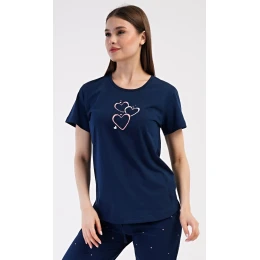 Dámské bavlněné kapri pyžamo Srdce. Dámské pyžamo se skládá z trička s krátkým rukávem a tříčtvrtečních kalhot. Tričko s kulatým výstřihem zdobí na hrudi obrázek srdíček. Kalhoty potištěné drobnými puntíky mají v pase gumu a šňůrku na stažení, jsou bez kapes. Použitý bavlněný materiál je příjemný a poddajný na dotek.