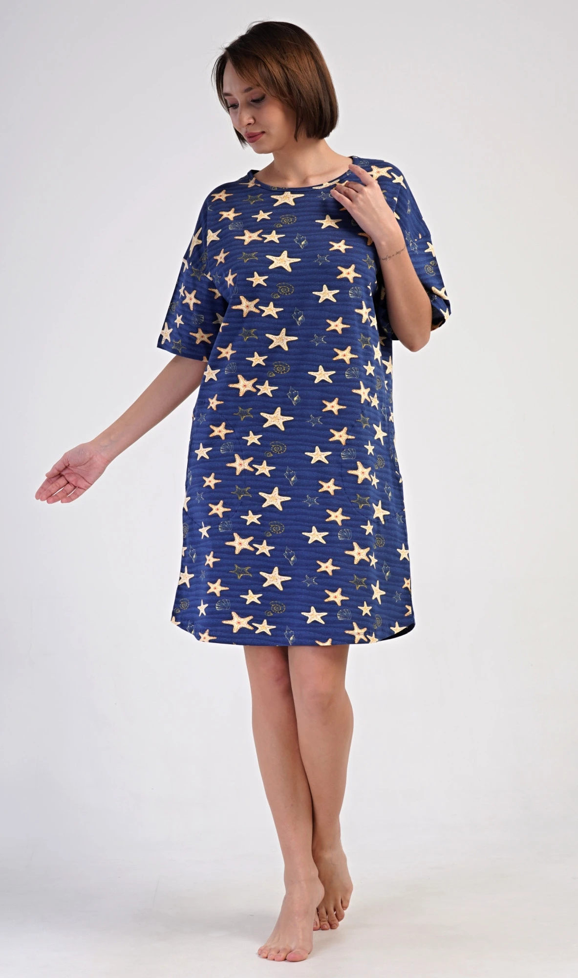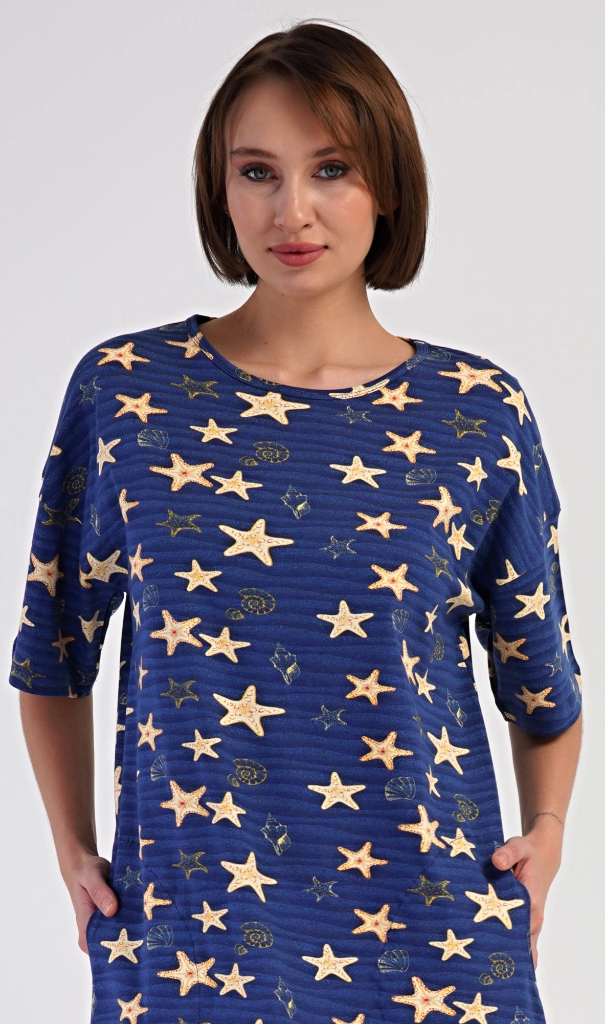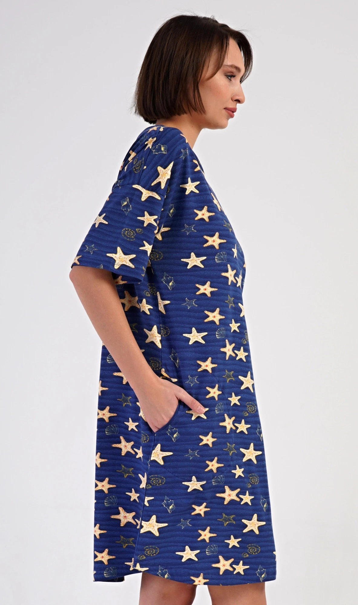Dámské bavlněné domácí šaty se spadeným rukávem Hvězdy. Domácí bavlněné šaty s kulatým výstřihem a kapsami zdobí žluté hvězdy. Použitý bavlněný materiál s příměsí lycry je příjemný a poddajný na dotek.