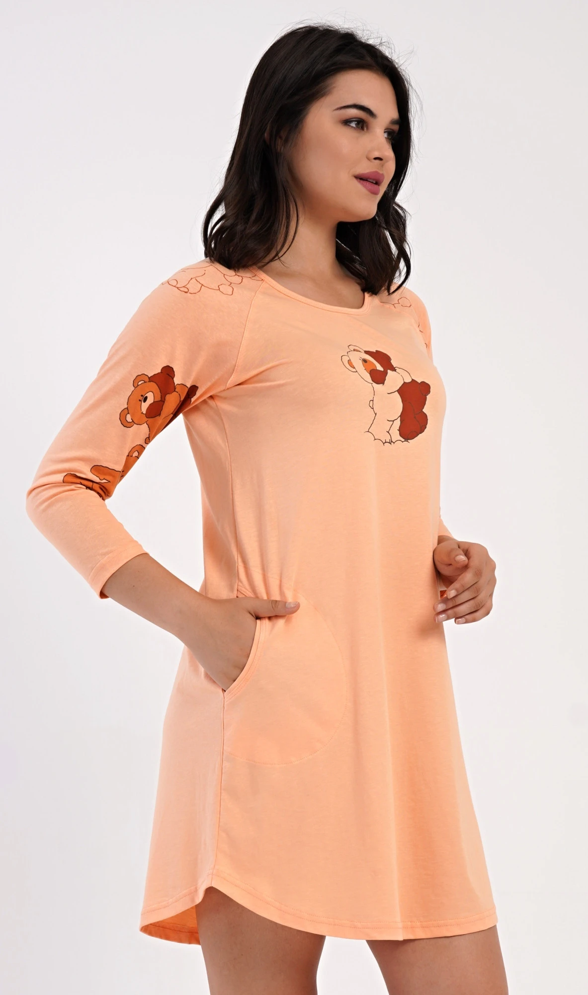 Dámské bavlněné domácí šaty s tříčtvrtečním rukávem Patricia. Domácí bavlněné šaty s kulatým výstřihem mají praktické kapsy, zdobí je na hrudi obrázek roztomilých medvědů. Tento motiv se opakuje i na rukávech. Použitý bavlněný materiál je příjemný a poddajný na dotek.