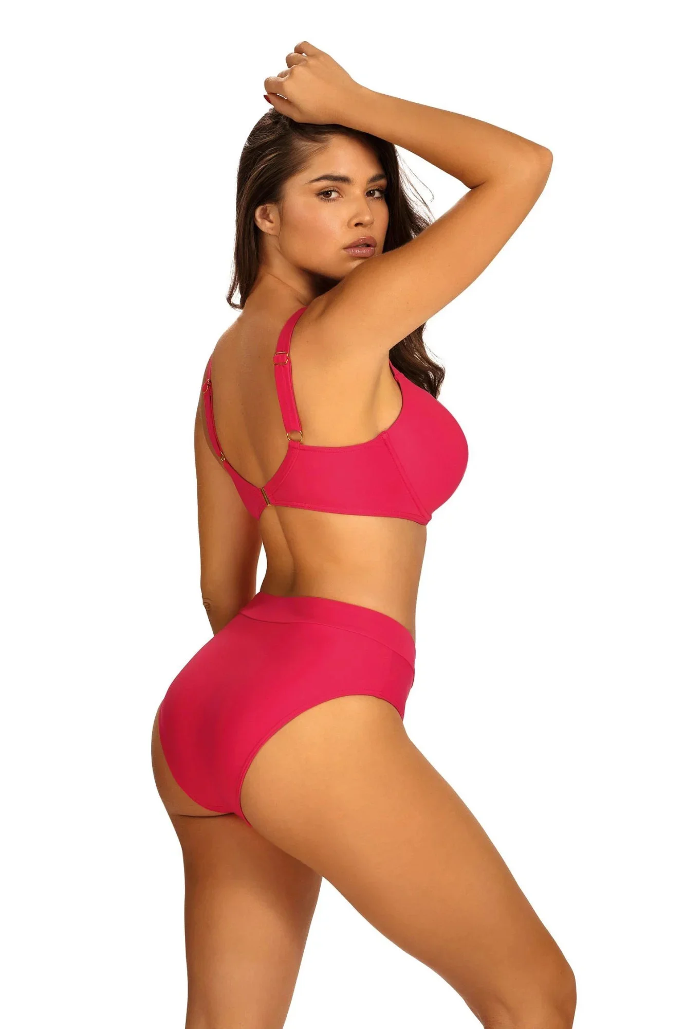 Dámské dvoudílné plavky Bayamon 6 995BM6 2 SELF - růžová barva - z hladkého mikrovlákna - vyztužené košíčky - mezi košíčky ozdoba - s kosticemi - nastavitelná a neodepínatelná ramínka - klasické kalhotky - vyšší pas - rychleschnoucí materiál, odolný proti chlóru a slunci