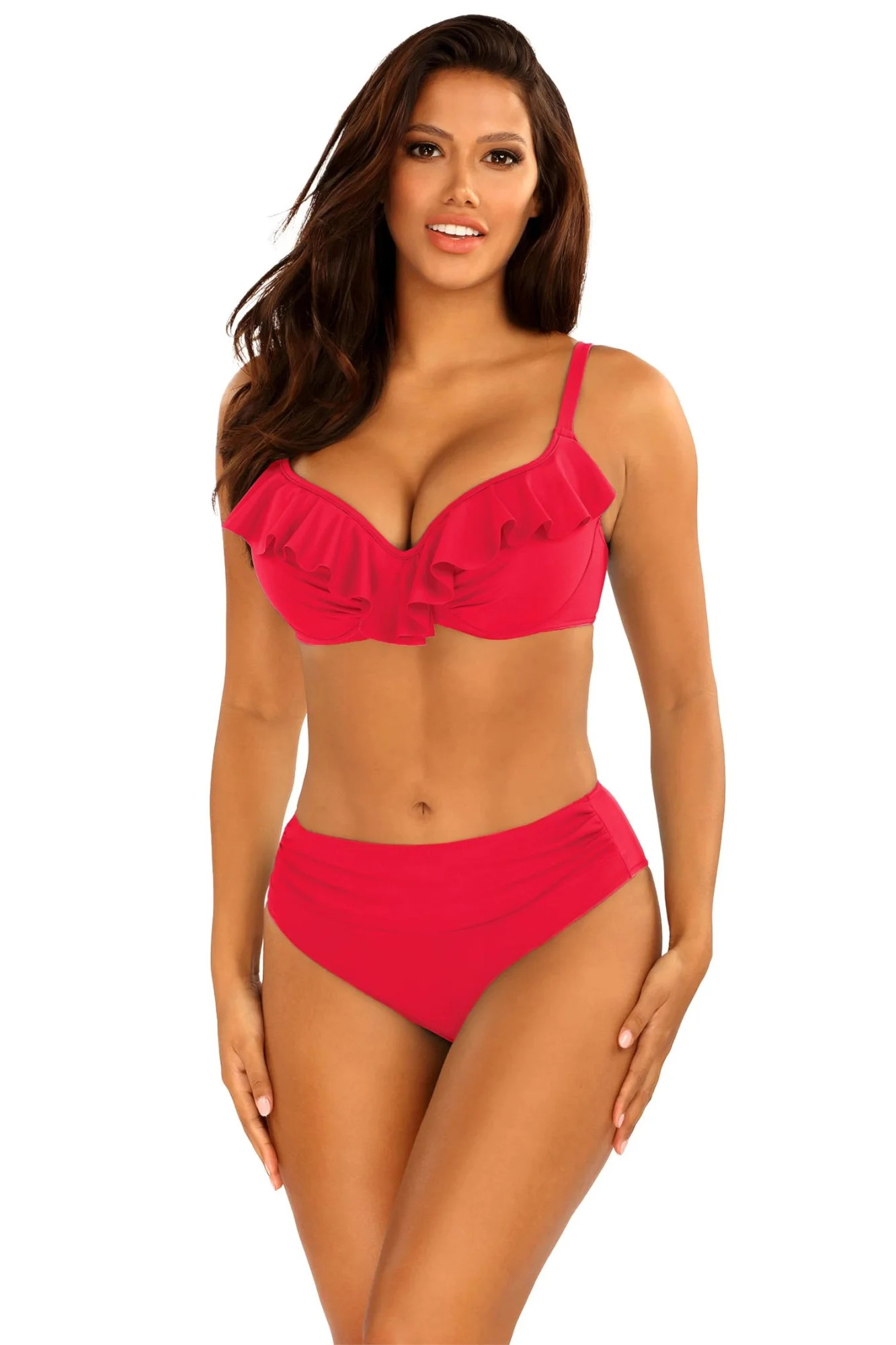Dámské dvoudílné plavky Canoy 10 940A1 red SELF - červená barva - z příjemného, pružného a rychleschnoucího materiálu - termicky formované - košíčky jsou vyztužené kosticemi - horní díl zdobený řasením - nastavitelná ramínka - zapínání vzadu - plavkové kalhotky klasického střihu - rychleschnoucí materiál, odolný proti chlóru a slunci