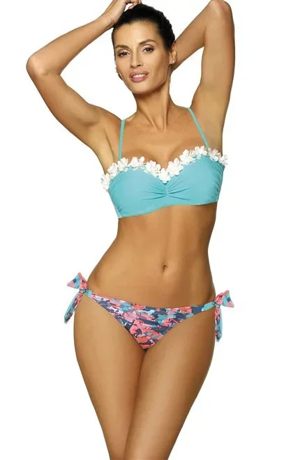 Módní dvoudílné plavky, které oceníte jak při plavání, tak i při opalování. Podprsenka modelu má střih typu bardotka a je ozdobená kontrastními květy. Košíčky jsou vytvarované. Ramínka je možné nastavit i odepnout. Podprsenka se vzadu zavazuje. Kalhotky typu brazilky se na bocích zavazují. Zadní díl kalhotek je vyrobený ze dvojité látky. Kalhotky zdobí květinový vzor. Model je vyrobený z velmi kvalitní italské látky Carvico Tesutti. Plavky rychle usychají a odolávají působení slunečních paprsků (neztrácí barvu a tvar).