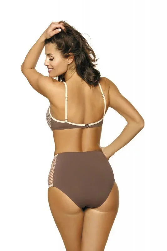Plavky jsou vyrobené z hladké látky a ažurové síťoviny. Podprsenka má vytvarované košíčky. Mezi košíčky je pěkné nařasení. Ramínka je možné nastavit, ale nelze je odepnout. Podprsenka se vzadu zapíná pohodlným klipem. Kalhotky mají vyšší střih.