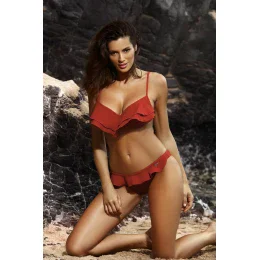 Tento outfit vám propůjčí výjimečný šarm (a navíc díky němu zapomenete na všechny své komplexy). Má skvělý střih. Byl vytvořen pro malé a středně velké poprsí - dobře sbírá, tvaruje a zvedá prsa a výrazně je zvětšuje. Dekolt získá půvab, sex-appeal a maximální ženskost. Jeho tajemství? - jsou košíčky vyztužené jemnou pěnou, s kosticemi a poměrně velkou push-up výplní, která je tentokrát umístěna trvale uvnitř podprsenky. Volánek ve výstřihu je jedním z hlavních trendů letošního léta. Nastavitelná ramínka, zavazování na zádech. Ke koketním kalhotkám typu rumpál, také s volánkem. Plavky byly ušity z krásné italské látky Carvico Fabrics a jsou k dispozici v řadě atraktivních plážových barev. Vyberte si ji podle svého gusta!