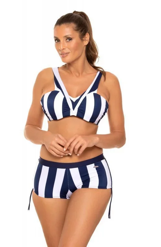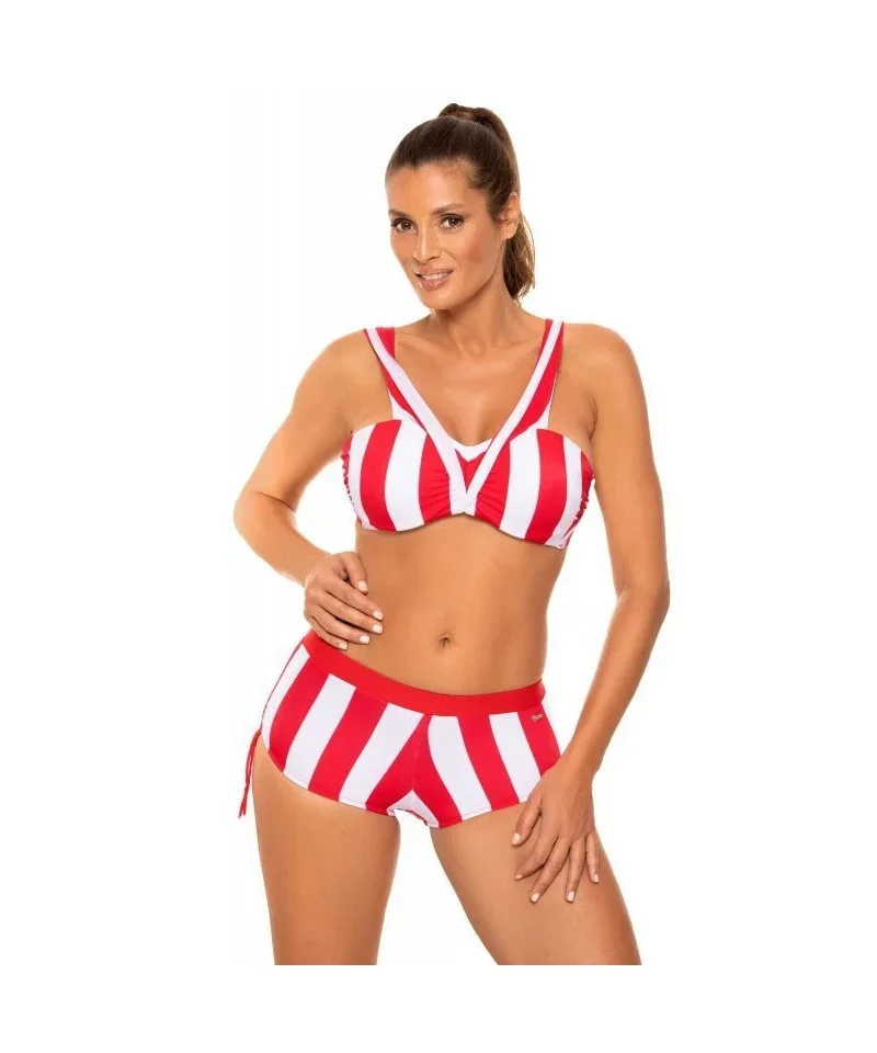 Dvoudílné plavky ideální pro malé a střední poprsí. Push-up střední velikosti neodnímatelný z modelu. Ramenní popruhy širší, přizpůsobené velikosti. Nízké elastické kalhotky se stahovacími šňůrkami. Vyrobeno z italské tkaniny Carvico Tessuti. Polský výrobek. Tip: objednejte si o číslo větší velikost než obvykle.