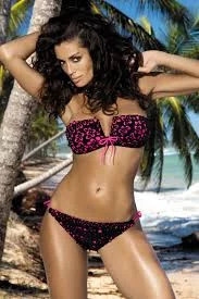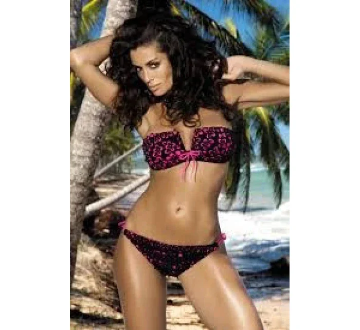 Atraktivní, neobyčejně originální a sexy model dámských plavek! Plavky Nelly z nové kolekce 2014 Vás uchvátí na první pohled. Jsou dvoudílné. Vrchní díl tvoří vyztužená podprsenka. Košíčky mají střih bandeau. Tento rovný střih krásně odhalí linii ňader a zvýrazní jejich tvar. Díky odnímatelným vycpávkám zvedne ňadra od spodní strany a dodá jim plnější vzhled. Spojení košíčků má hezký výstřih. Tvoří písmeno V a mnohem více ňadra zvýrazňuje. Košíčky vynikají díky hezkému 3D vzoru. Spodní vrstva má výraznou růžovou barvu. Tu překrývá černá tkanina s vystřihovanými ornamenty květin. Vytváří nádherný efekt a vypadají velmi originálně. Podprsenka se zapíná na zádech pomocí kovové spony. Kov je samozřejmě antialergický a nezpůsobuje žádné alergické reakce.Materiál 80%Polyamid, 20%Elastan