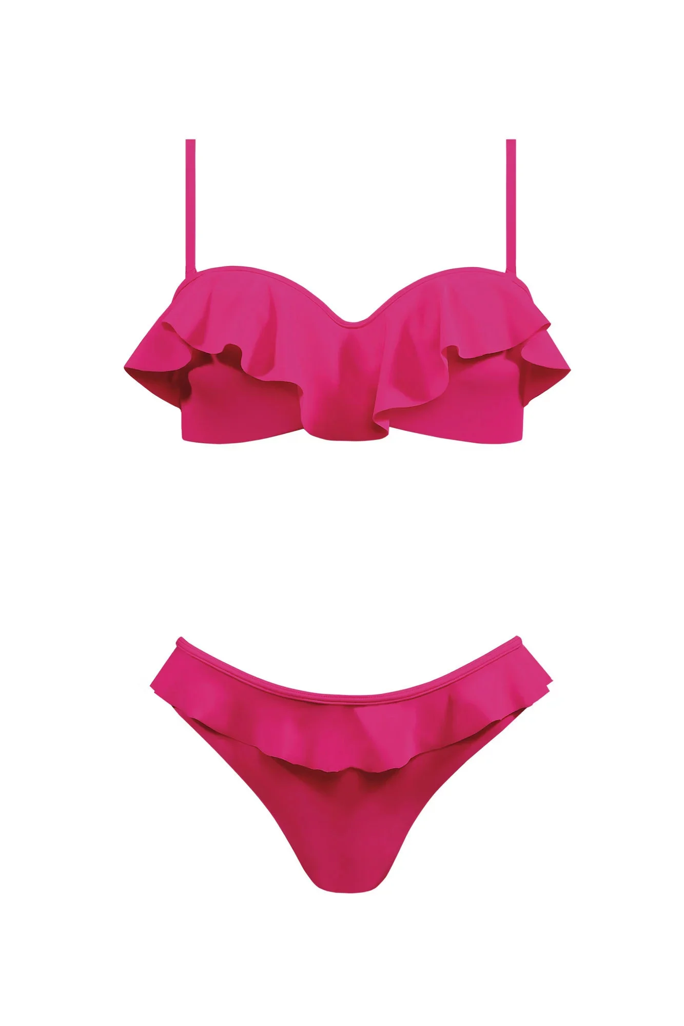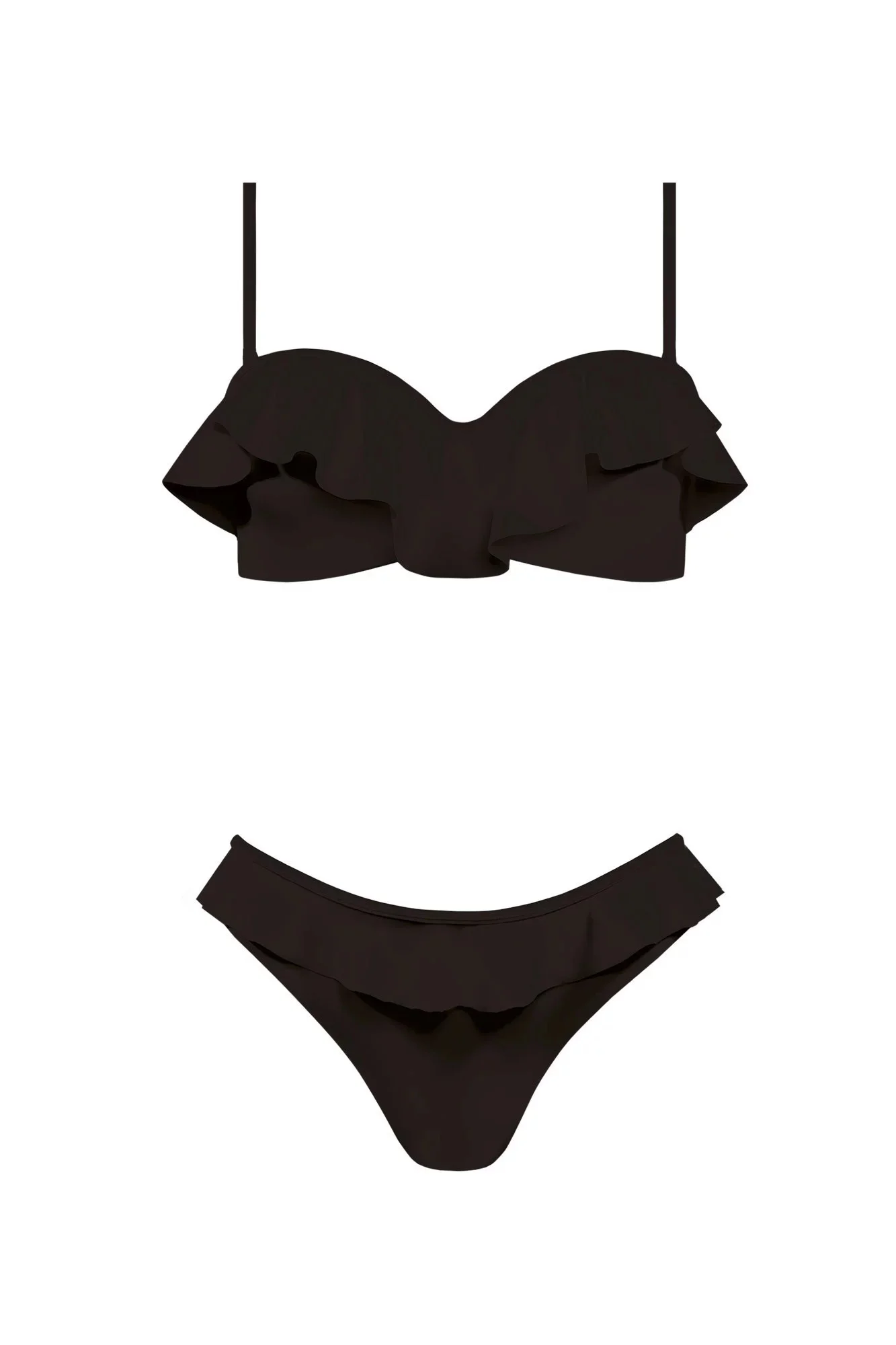 Dámské luxusní dvoudílné plavky. Vrchní díl vyztužené, v balkónovém střihu, se skrytou kosticí. Na podprsence je našitý rafinovaný volánek. Ramínka jsou na kovové posouvání.