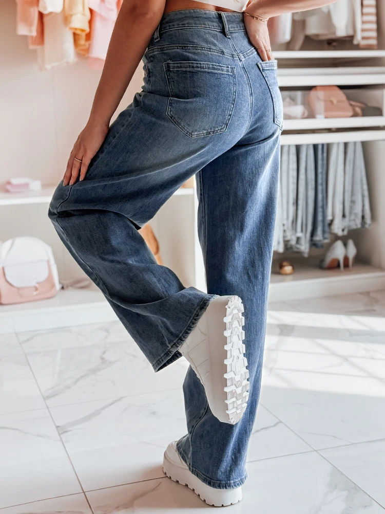 Džínové baggy kalhoty s vysokým sedem jsou módní alternativou ke klasickým drezurám a rovným střihům. Volné nohavice v kombinaci s vypasovaným pasem vytvářejí výraznou a poutavou siluetu. Model má zapínání na knoflík a zip a čtyři klasické kapsy. Ideální na jaro - k teniskám, žabkám nebo i těžším botám.