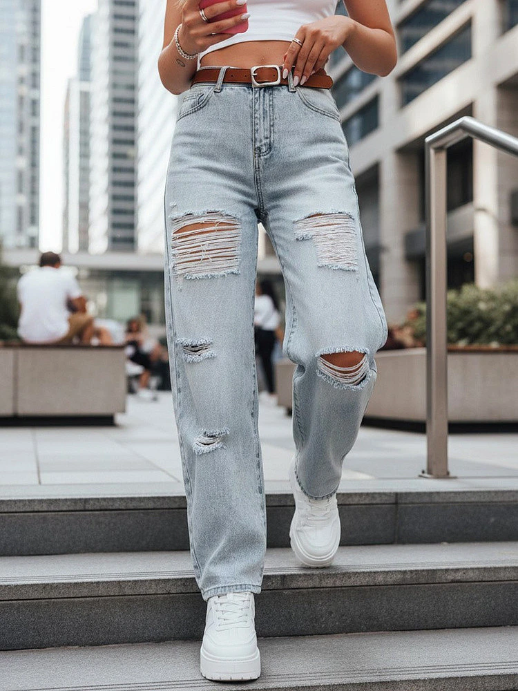 Dámské pytlovité kalhoty z lehkého, mírně sepraného denimu jsou pohodlnou a stylovou volbou pro každodenní nošení. Vysoký pas krásně zvýrazňuje pas, zatímco volnější střih zajišťuje volnost pohybu. Charakteristické rozpárání a díry na nohavicích dodávají celému vzhledu módní nádech. Zapínání na knoflík a zip zaručuje pohodlí, zatímco klasické kapsy a pásek, který je součástí kompletu, dělají z tohoto modelu kompletní řešení pro každodenní jarní dny.
