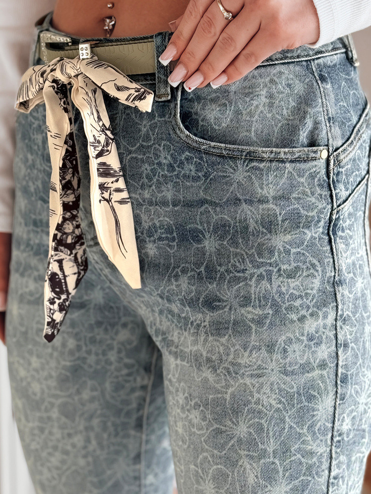 Stylové džíny s vysokým pasem pro dokonalou siluetu. Model slim fit zaručuje perfektní padnutí a jemný květinový vzor jim dodává jedinečný charakter. Díky klasickým kapsám jsou praktické pro každodenní nošení a pro doplnění vzhledu jsou vybaveny ozdobným páskem. Perfektní pro každodenní i elegantnější outfity.