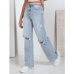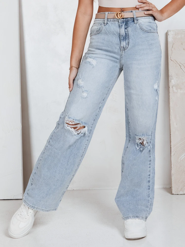 Džínové pytlovité kalhoty s vysokým sedem a ozdobným roztržením jsou dokonalou kombinací stylu a pohodlí. Klasický střih s pěti kapsami a zapínáním na knoflík a zip podtrhuje nadčasový charakter. Široké nohavice dodávají nonšalantnost a zajišťují naprostou volnost pohybu. Vysoký sed opticky prodlužuje nohy a zdůrazňuje postavu. Model je ideální pro každodenní a ležérní outfity.