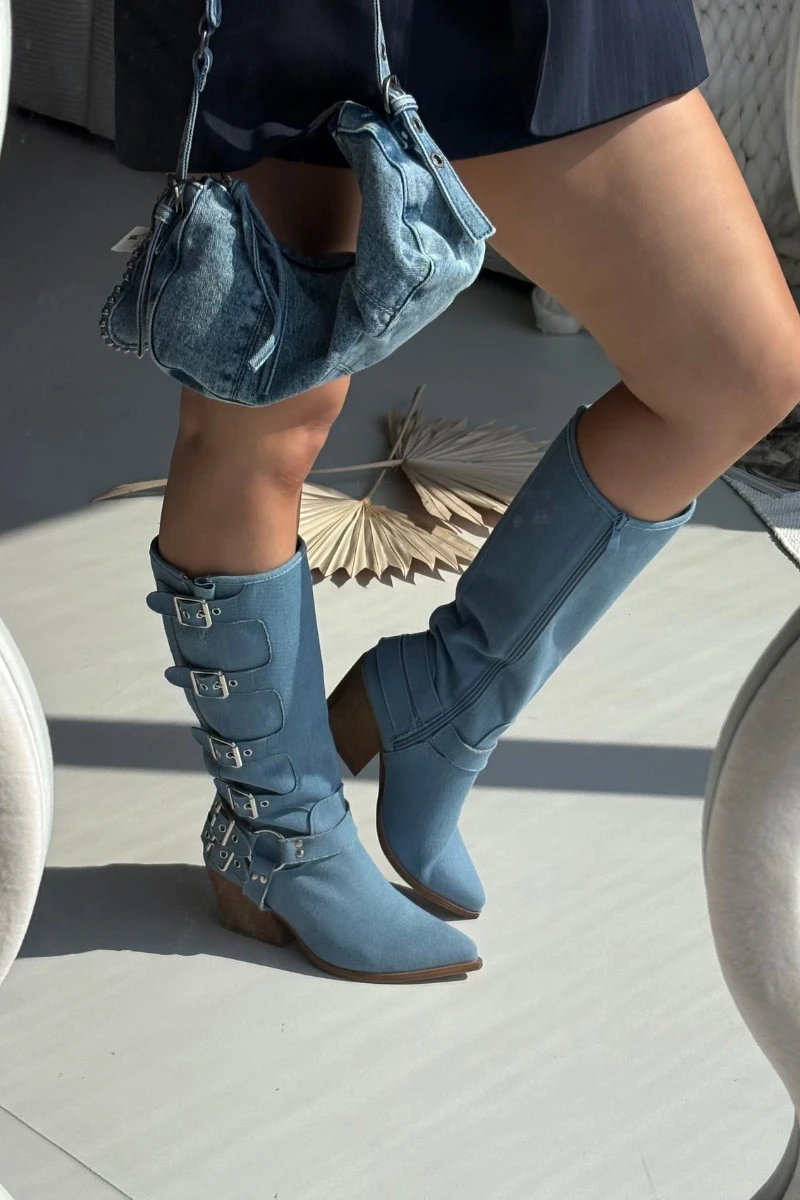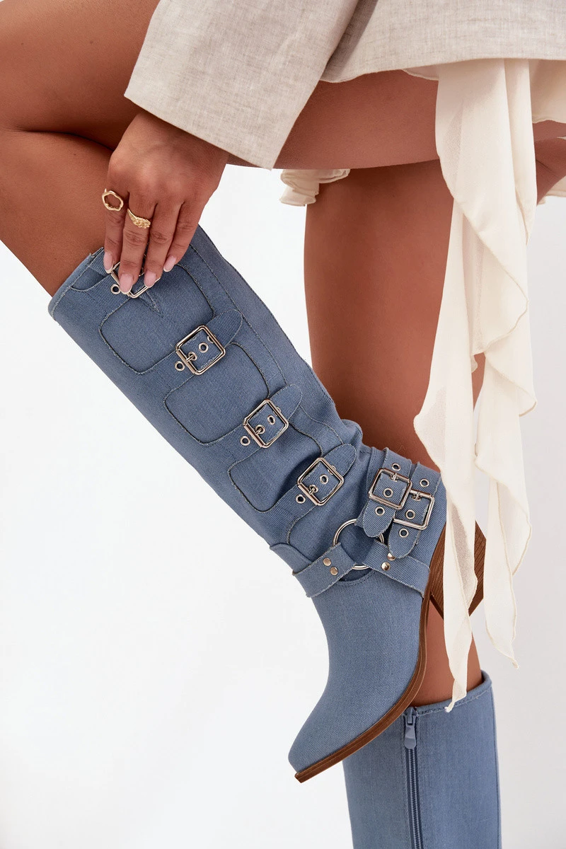 Dámské džínové kozačky kovbojského stylu na podpatku s přezkami Fivelle – jeansové