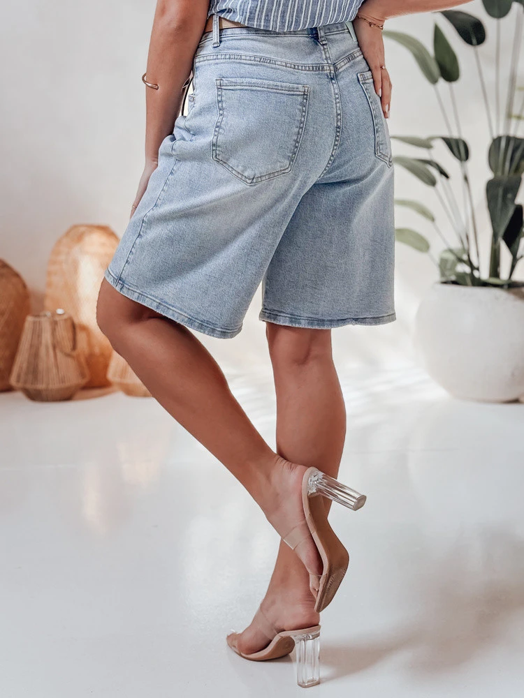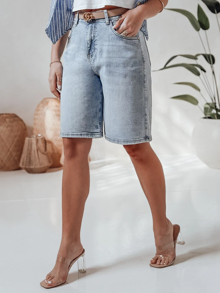 Dámské džínové šortky v délce ke kolenům jsou pohodlnou a stylovou volbou pro teplejší dny. Klasické kapsy, střední výška se zapínáním na knoflíky, ideální pro ležérní outfity, mírně přizpůsobené pro zvýraznění siluety a zajištění volnosti pohybu. Ideální na léto, procházky a víkendové výlety.