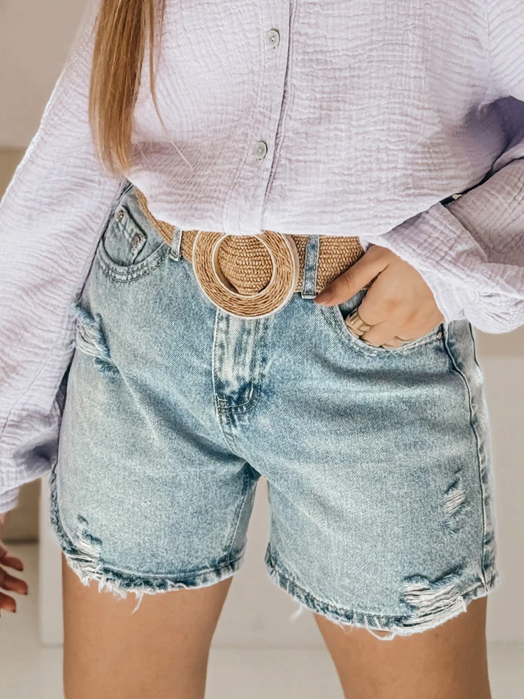 Tyto dámské džínové šortky s roztřepeným efektem jsou skvělým základem pro letní styling, mají střední výšku, zapínání na zip a knoflík, široké nohavice pro naprostou volnost pohybu a pohodlí, roztřepené okraje a módní dírky pro větší osobitost.