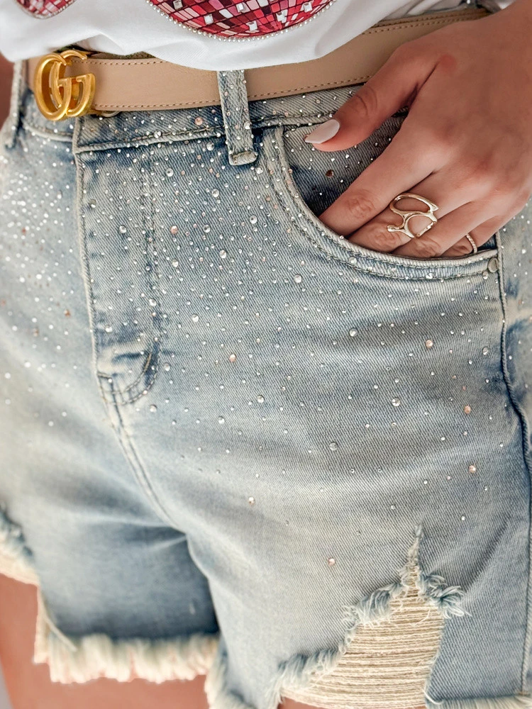 Džínové šortky jsou skvělou volbou pro milovnice lesku a pohodlí v jednom. Jemné zirkony po celém povrchu vytvářejí světelný list, který se při pohybu krásně třpytí. Rozparky na nohavicích a roztřepené lemy dodávají městský nádech. Model s klasickým zapínáním a ozdobnými kapsami dokonale padne na siluetu. Perfektní na jarní procházky, letní festivaly nebo každodenní sety s topem.