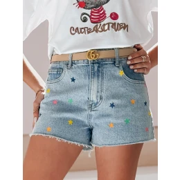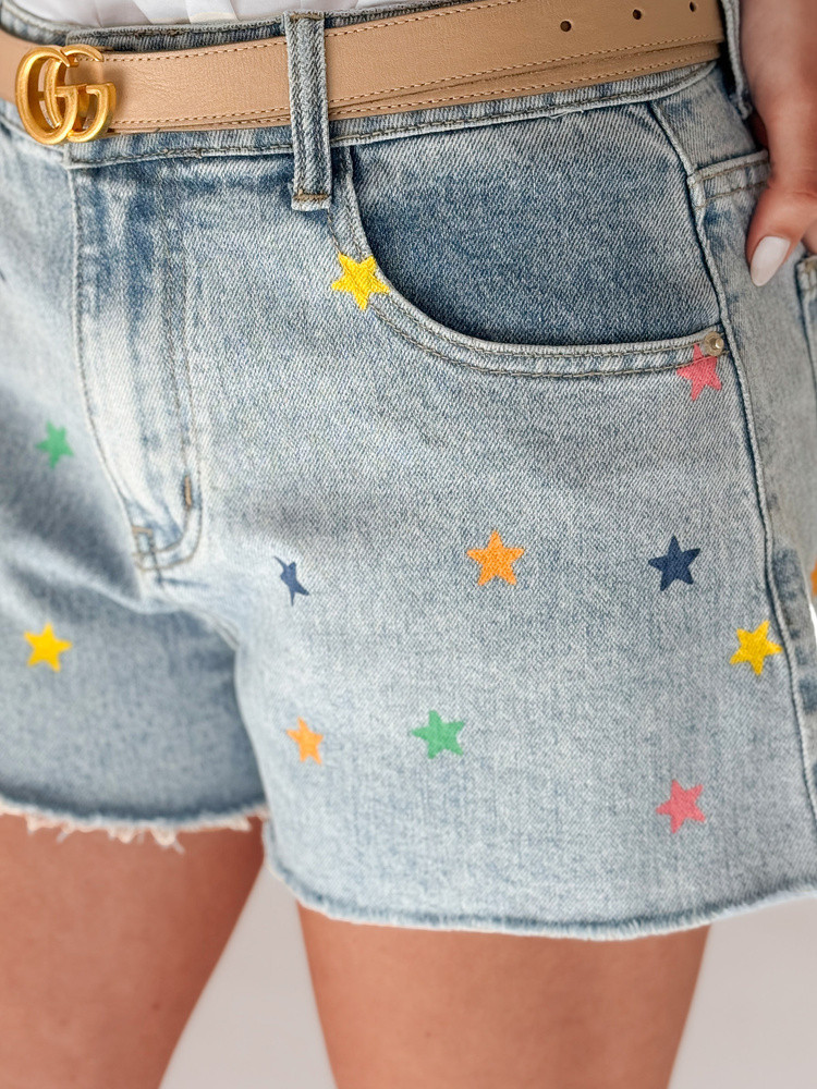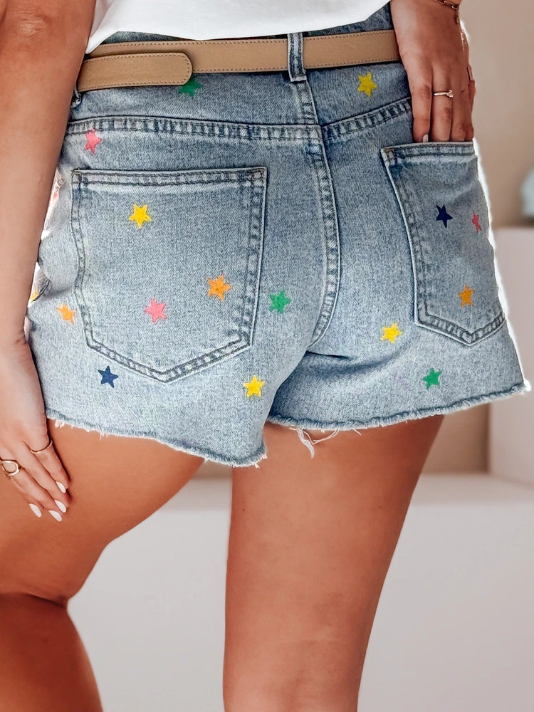 Tyto džínové šortky s vysokým pasem a barevným potiskem hvězdiček mají roztřepený lem nohavic a mírně volnější střih pro celodenní pohodlí, zatímco barevné hvězdičky dodávají dívčí nádech a lehkost, která je ideální pro jarní nebo letní dny.