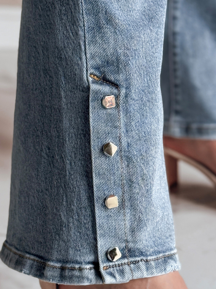 Džínové kalhoty s rozšířenými nohavicemi jsou skvělou volbou pro příznivce módní klasiky, s klasickými kapsami a poutavým zdobením ve spodní části nohavic. Středně vysoký střih zajišťuje pohodlí, zatímco pásek, který je součástí balení, umožňuje dokonalé přizpůsobení. Zapínání na knoflíky a zip se hodí k různým outfitům.