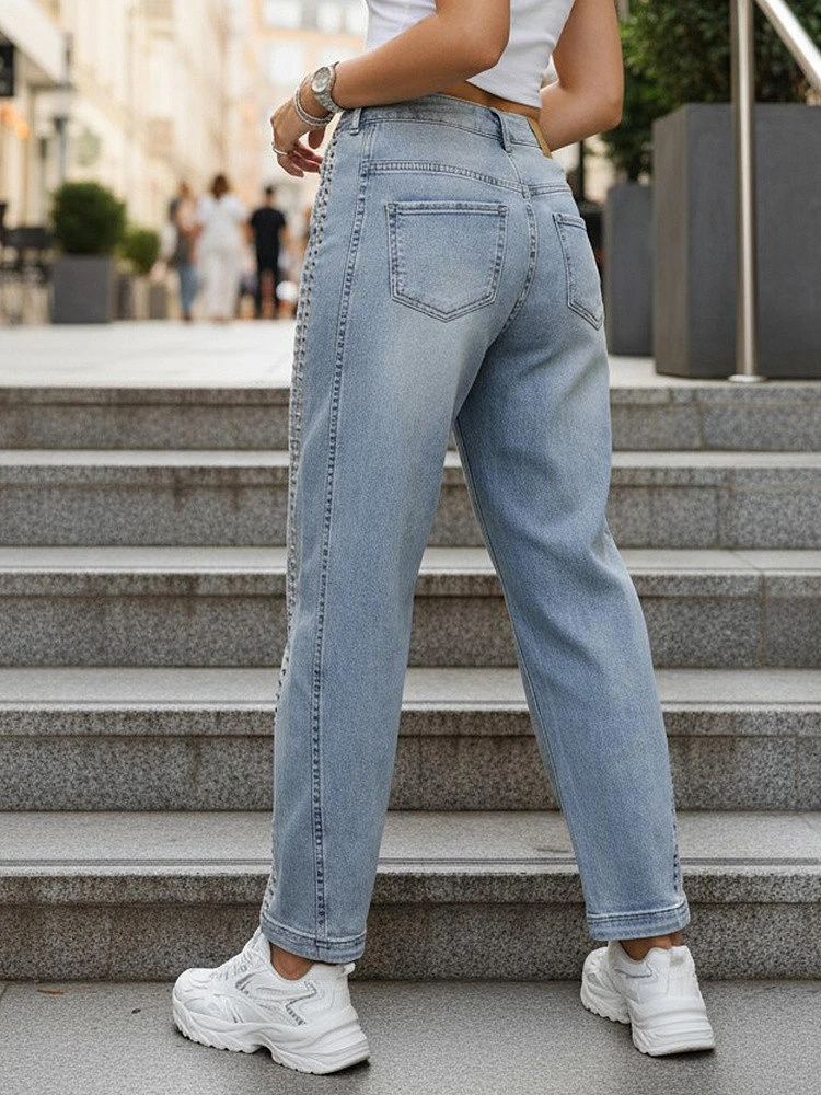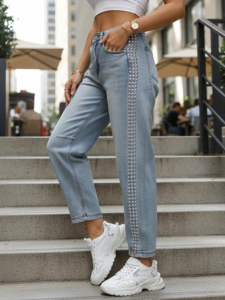 Tyto dámské džíny balonového střihu se vyznačují volnějším střihem a pohodlným střihem. Mírně zúžené nohavice a vyšší výška zajišťují pohodlné nošení a zdůrazňují proporce. Klasické zapínání na knoflík a zip zajišťuje stabilní střih. Ozdobné nýty podél nohavic dodávají výrazný nádech.