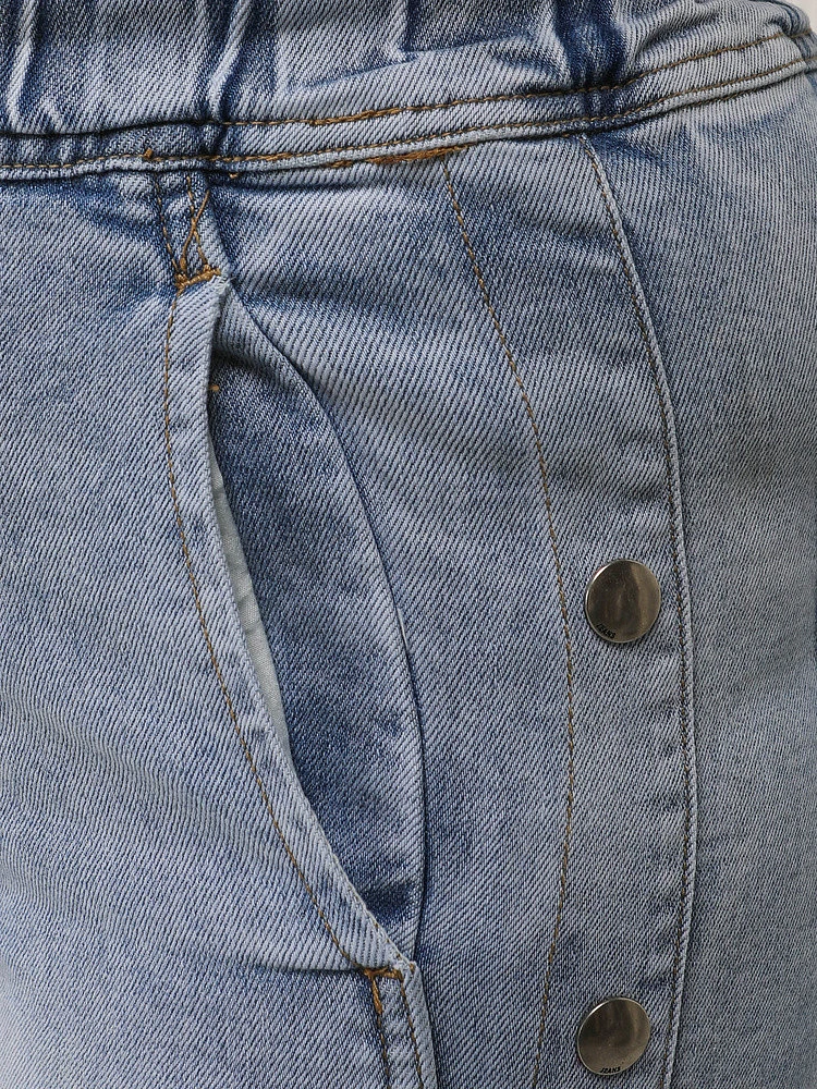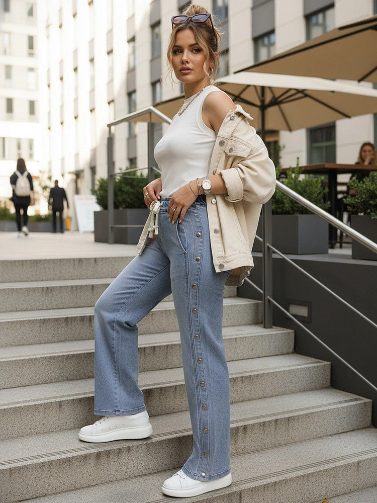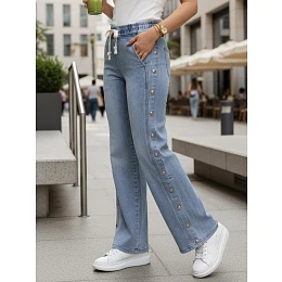 Dámské džíny volného střihu se širokou nohavicí poskytují volnost pohybu a pohodlí při každodenním nošení. Elastický pas se stahovací šňůrkou umožňuje snadné přizpůsobení. Džínsový materiál dobře sedí na těle a zachovává si svůj tvar. Ozdobné patentky na bocích dodávají celkovému vzhledu moderní nádech.