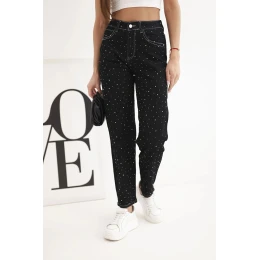 Dámské džíny s vysokým pasem a ozdobami černé