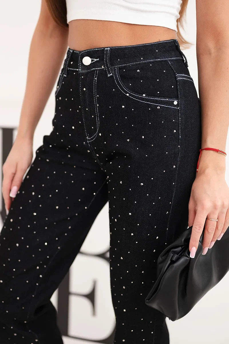 Pokud hledáte džíny, které spojují pohodlí, styl a módní akcent – tyto dámské džíny s vysokým pasem a jemnými ozdobami budou trefou do černého! Klasický černý denim byl obohacen o jemné třpytky, které krásně odrážejí světlo a dodávají eleganci každému outfitu. Rovný střih a elastický materiál zajišťují, že kalhoty skvěle padnou na postavě a jsou nesmírně pohodlné na nošení.