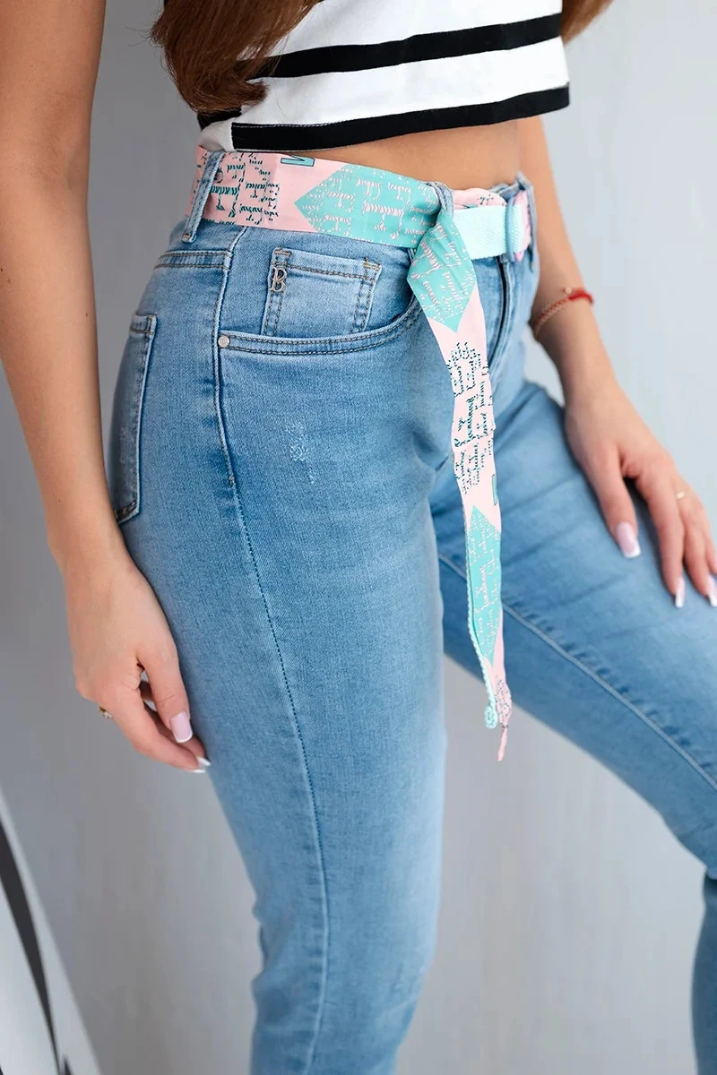Dámské jeansy v mom fit stylu jsou módní klasikou, která získává nový rozměr díky doplňkům – tento model se vyznačuje barevným páskem, který dodává stylizaci svěžest a charakter. Vysoký pas a mírně zúžené nohavice podtrhují ženskou siluetu, zároveň zajišťují plné pohodlí při nošení.