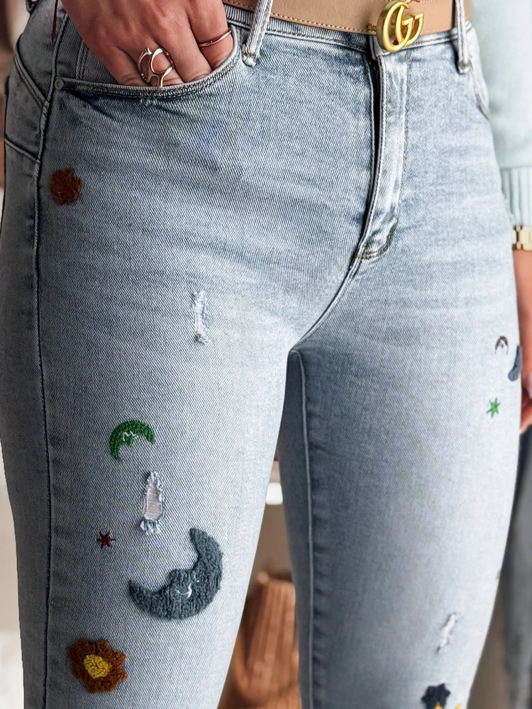 Stylové skinny džíny s originální výšivkou inspirovanou vesmírem. Vyšívané měsíce a hvězdy jim dodávají jedinečný charakter, zatímco odřené švy decentně podtrhují jejich módní vzhled. Díky ozdobným kapsám a středně vysokému střihu jsou pohodlné a dobře padnoucí, ideální pro každodenní nošení.