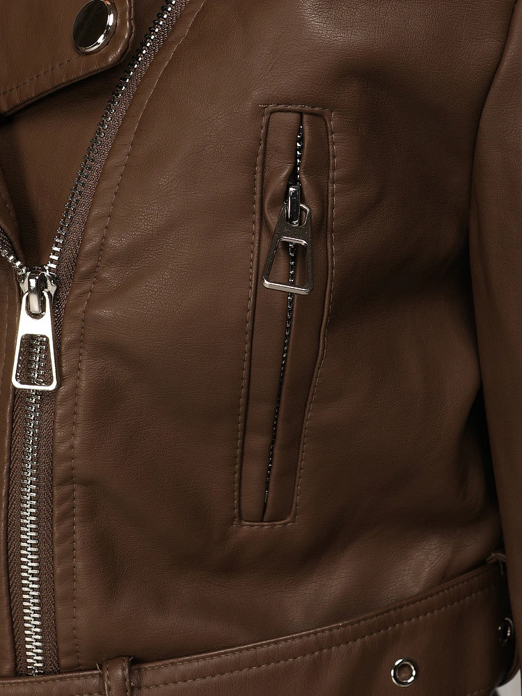 Nadčasový základ šatníku pro každodenní nošení, tato bunda ve stylu ramonesky je krátkého střihu, který zvýrazňuje postavu a dobře se kombinuje s oblečením s vysokým pasem. Je vyrobena z ekokůže pro estetický vzhled a pohodlné nošení a výrazné detaily jí dodávají osobitý městský styl.