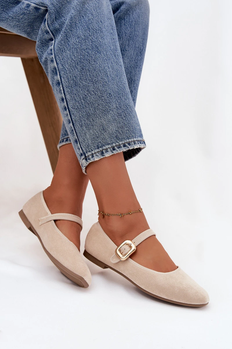 Dámské eko semišové baleríny s páskem a zlatou přezkou Adelora – světle béžové