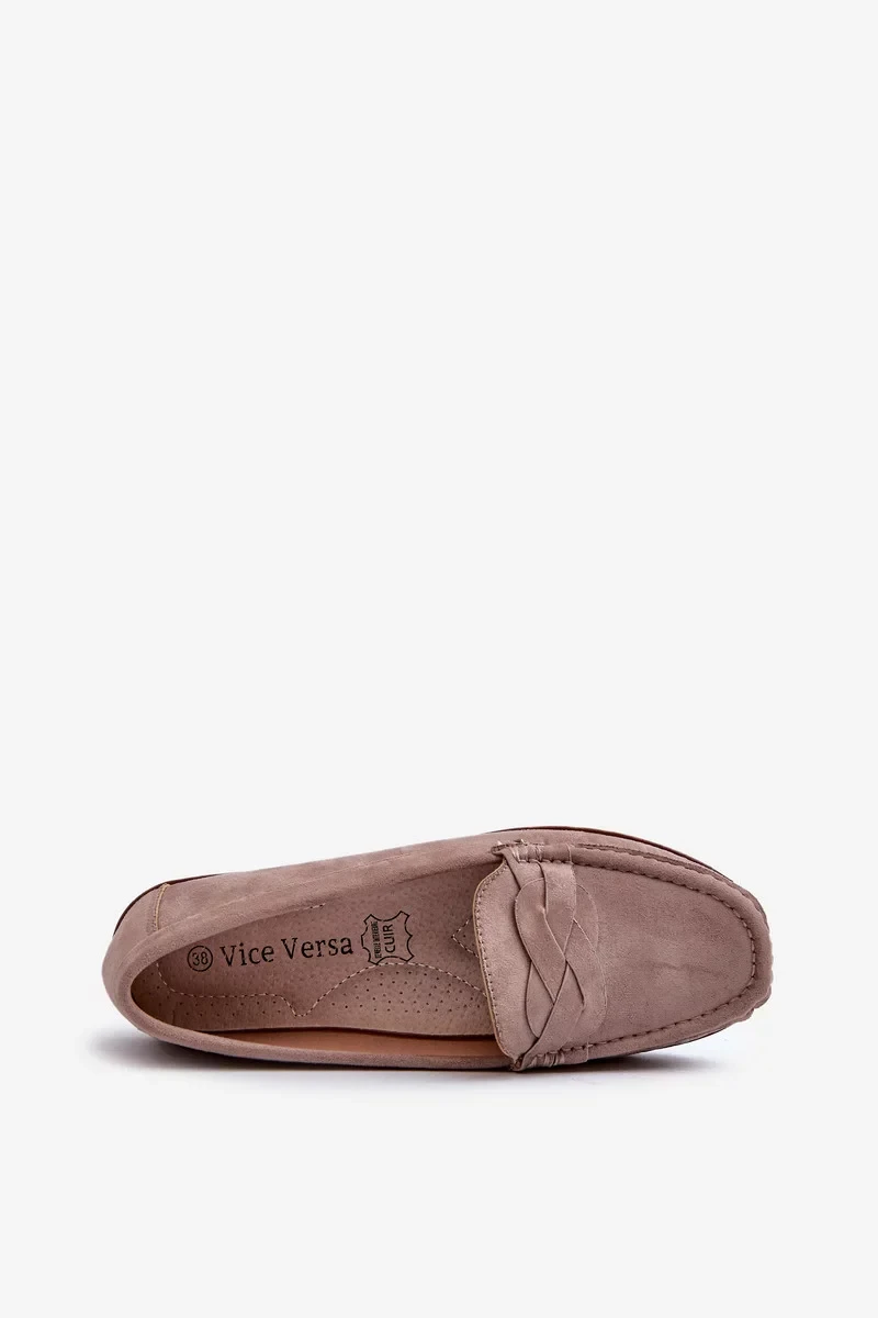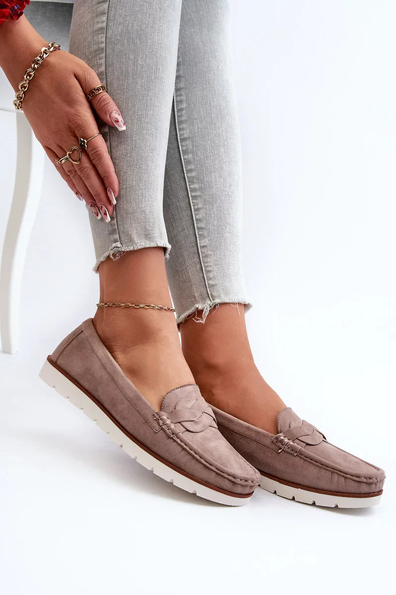 Dámské mokasíny vyrobené z eko semiše. Přední strana zdobená propletenými pruhy. Zaoblené prsty. Měkká stélka z přírodní kůže. Podešev z pryžového materiálu. Tento model skvěle doplní mnoho ležérních stylů. Při výběru velikosti se řiďte tabulkou velikostí.