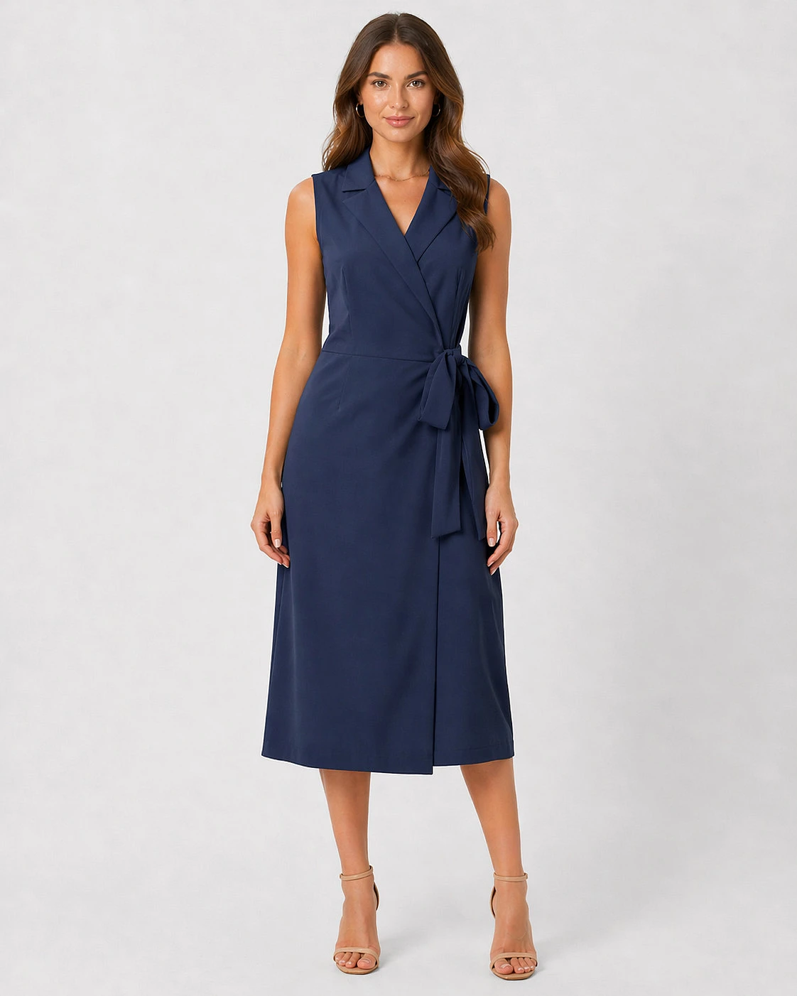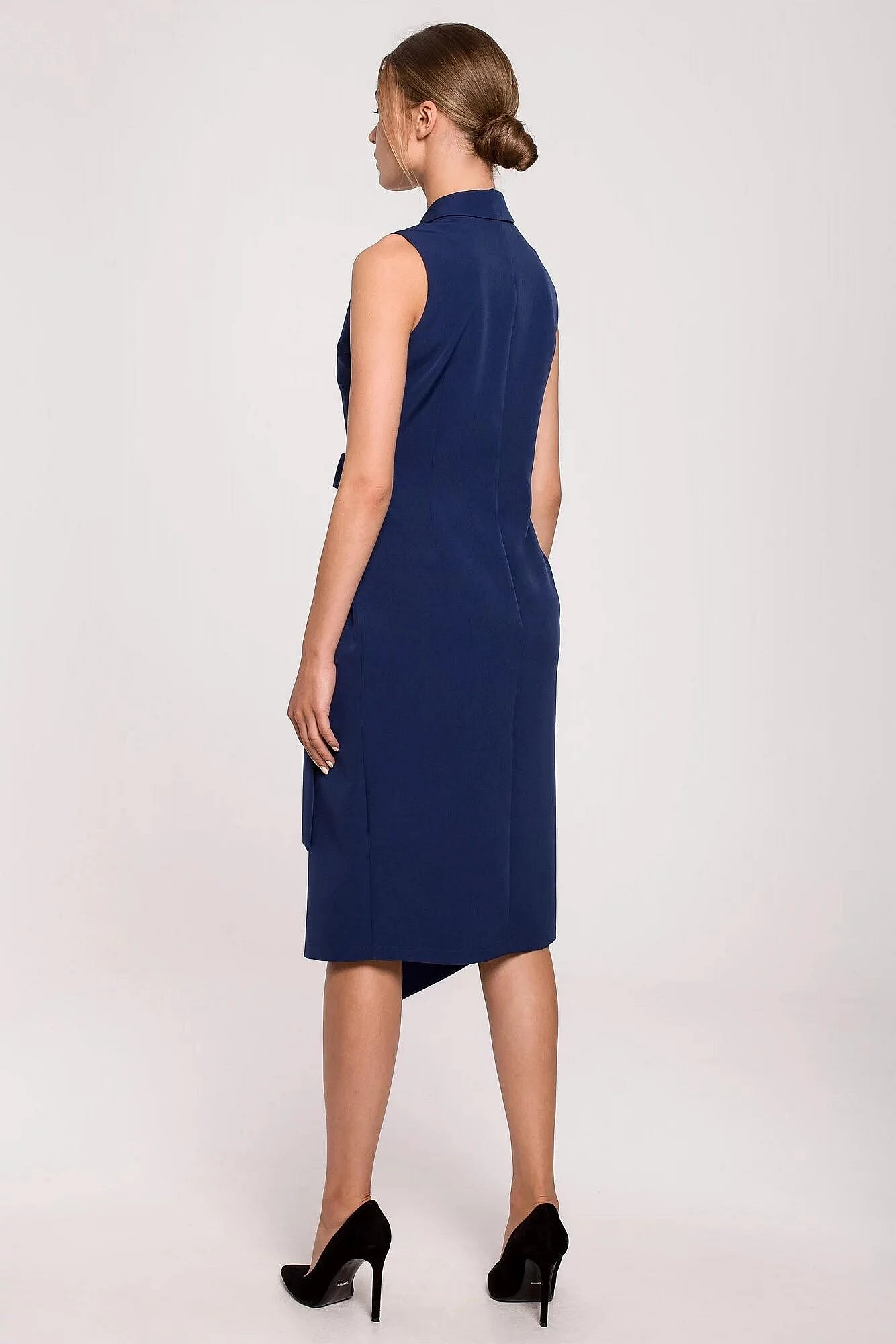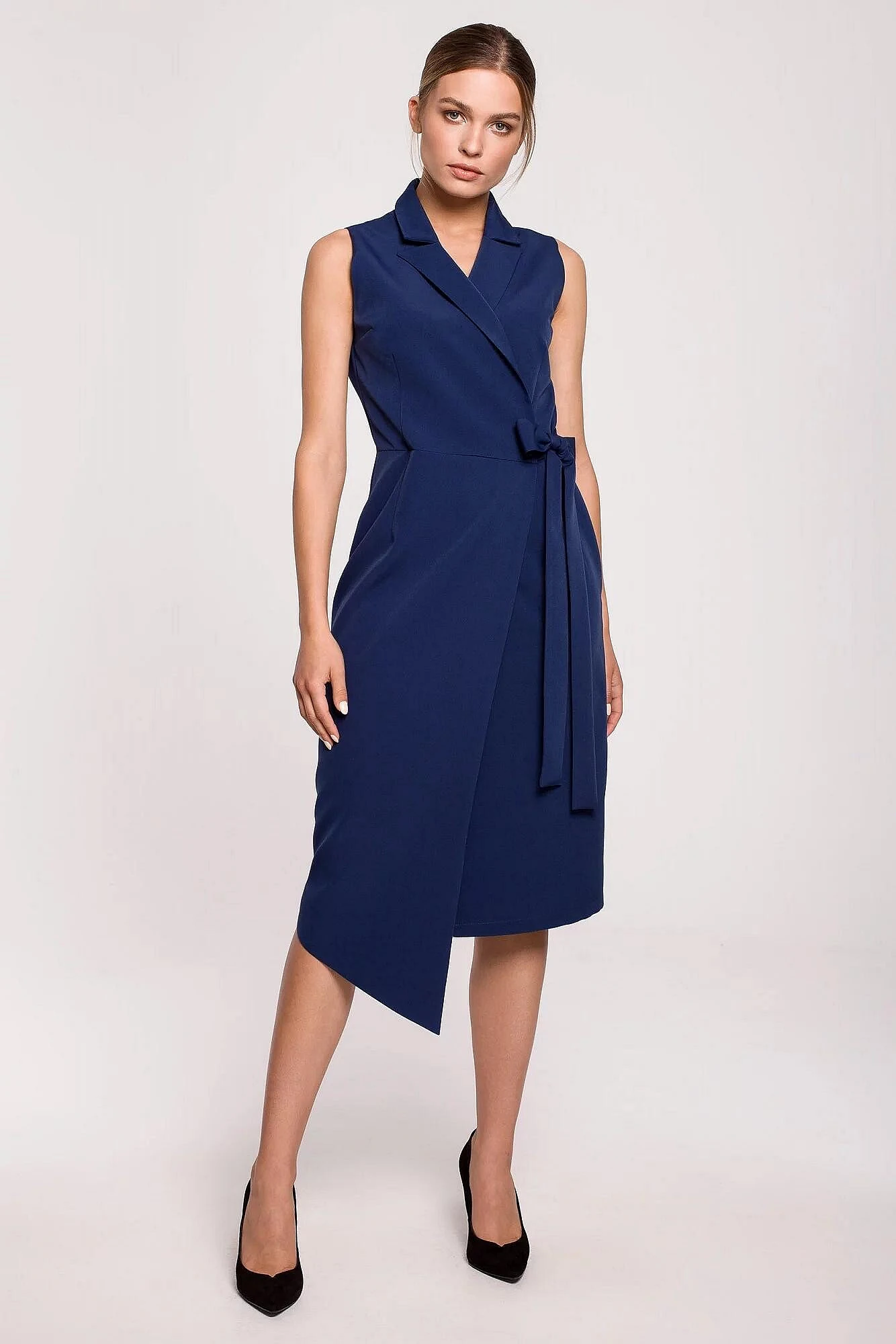 Dámské midi šaty značky Stylove zaujmou na první pohled svým elegantním střihem inspirovaným sakem. Bezrukávový design, výrazný límec do V a zavazování v pase vytvářejí ženskou siluetu, která působí upraveně, moderně a velmi vkusně. Midi délka pod kolena dodává modelu sofistikovaný vzhled, takže se šaty skvěle hodí do práce, na schůzku, oslavu i další společenské příležitosti.